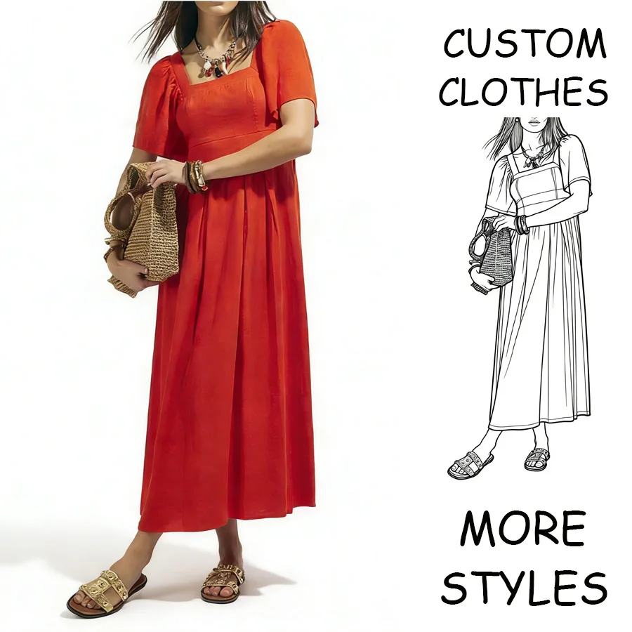 Custom Maxi Square Neck Linen A-Line Dresses Women Casual Short Puff Sleeves Shirred Top Fashionable Wholesale Solid Pattern