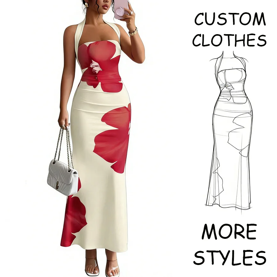 Custom New Modern Bow Neck High Waist A-Line Maxi Contrasting Floral Print Elegant and Fashionable Summer Dresses Women Casual