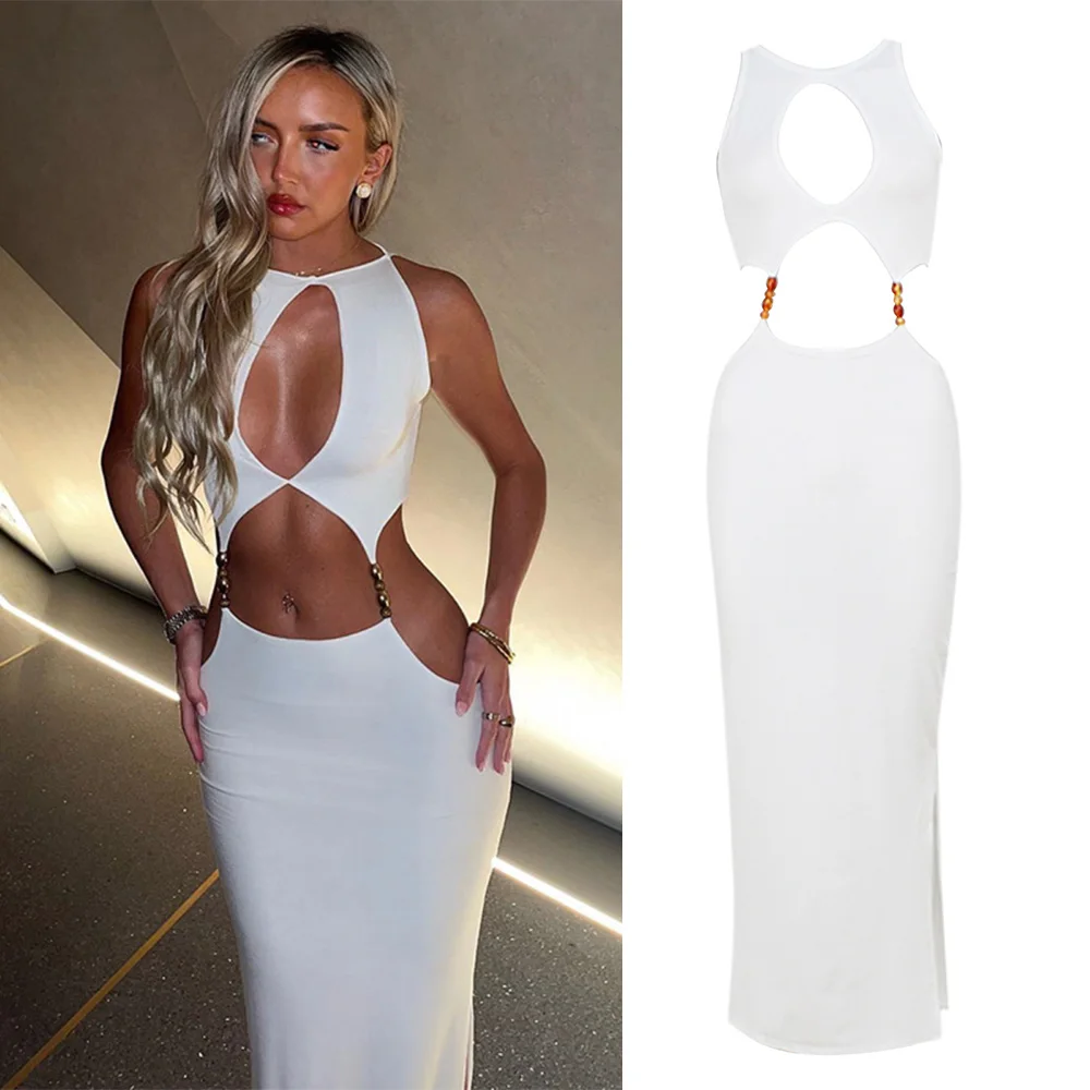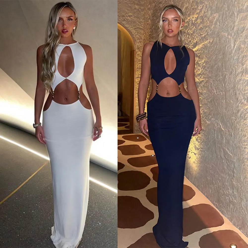 Custom Luxury Women's Dresses Summer Spice Girl Long Dress Fashion Sexy Slim Hollow Out Skirt Women Party Club White Dress