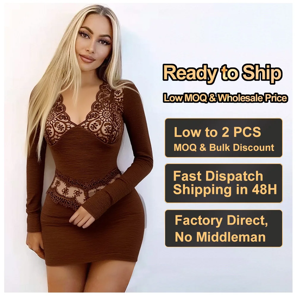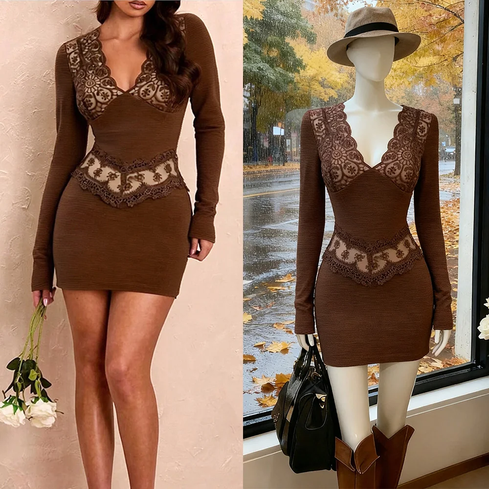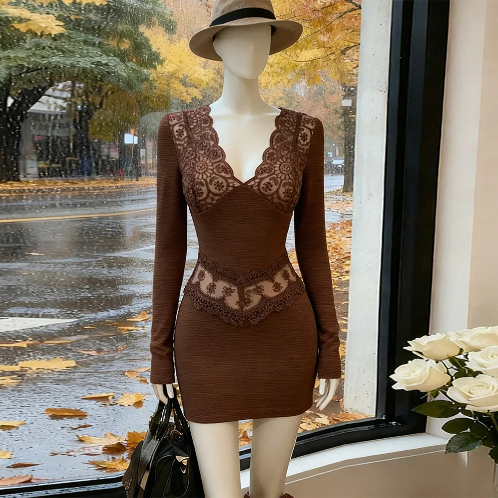 Plus Size Women Dress Lace Long Sleeve V-Neck Empire Waist Bodycon Mini Dress Custom Hollow Out Casual Brown Dress OEM Wholesale