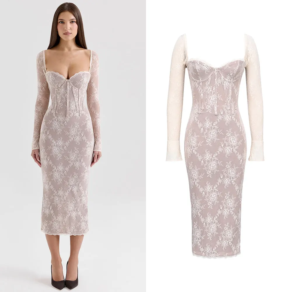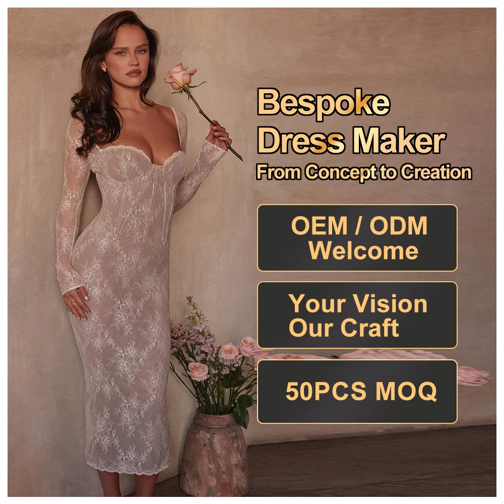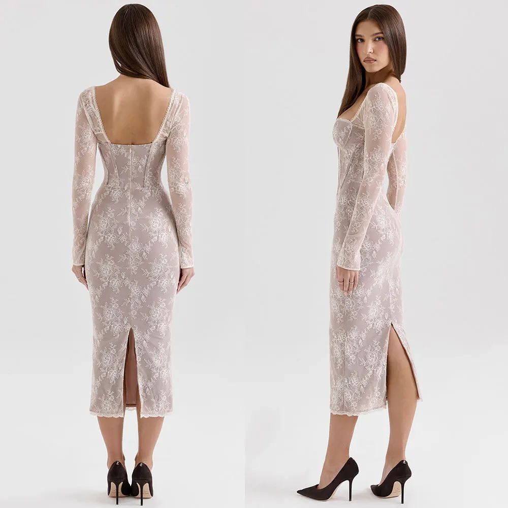 Custom Wholesale Luxury Women's Elegant Square Neck Evening Dress Long Lace Maxi Length with Empire Waist Wholesale Party Dress