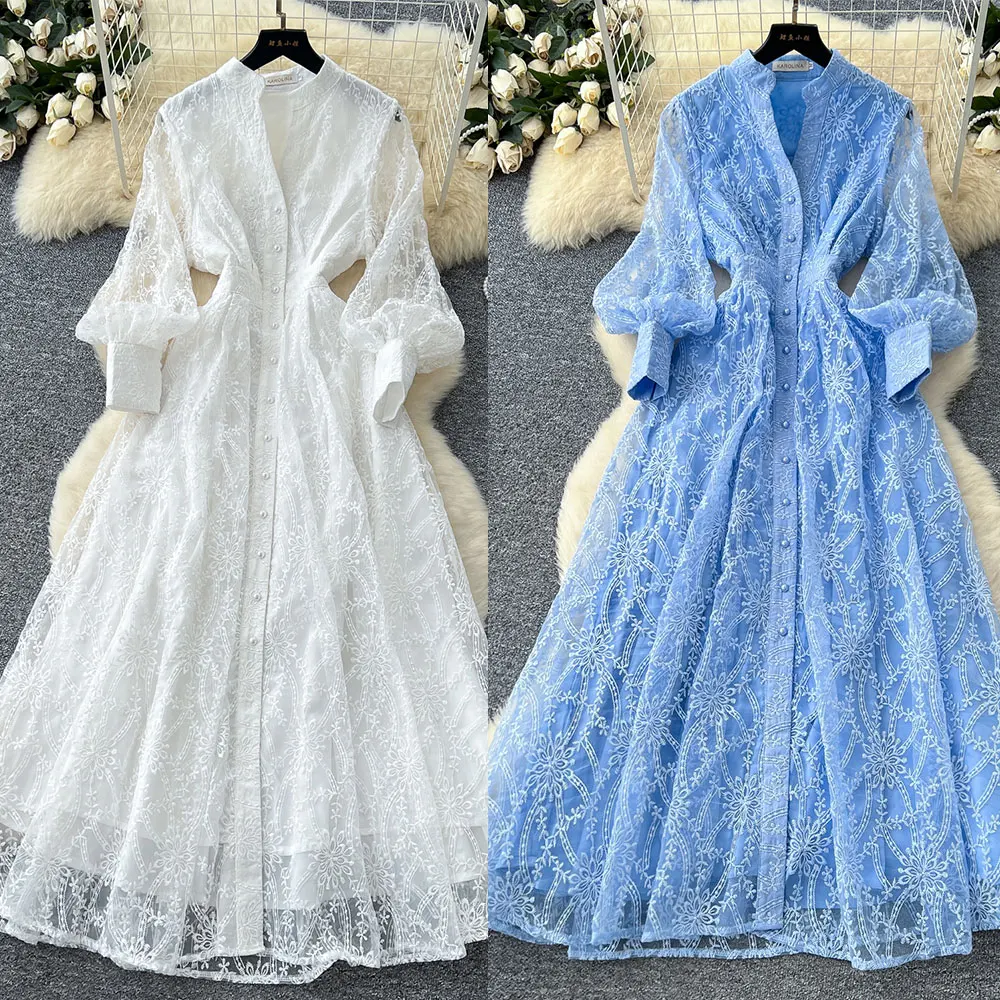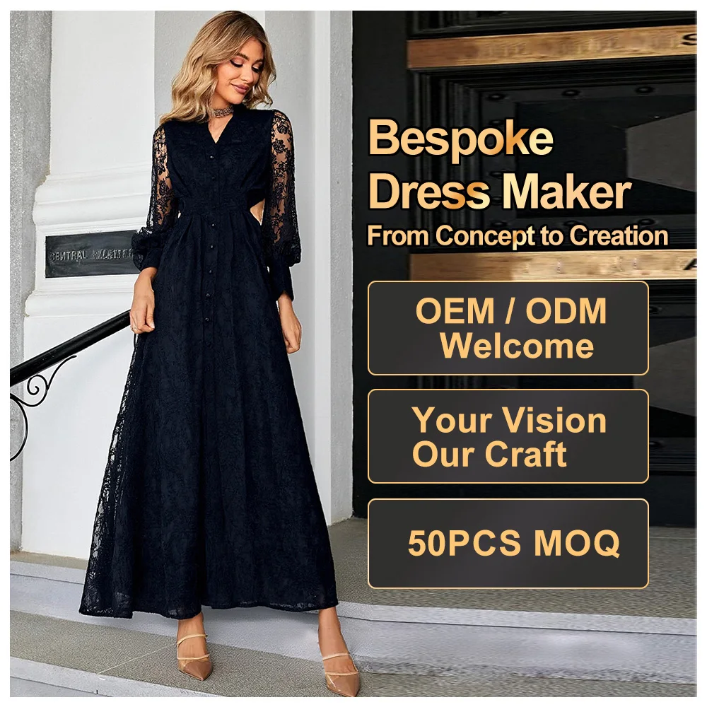 Custom Wholesale 2025 Autumn Bodycon Dresses Long Sleeves Retro Embroidery Waist Slimming Lace Casual Maxi Women's Evening Dress