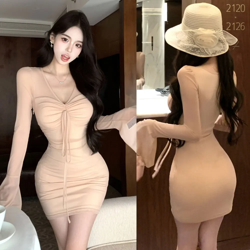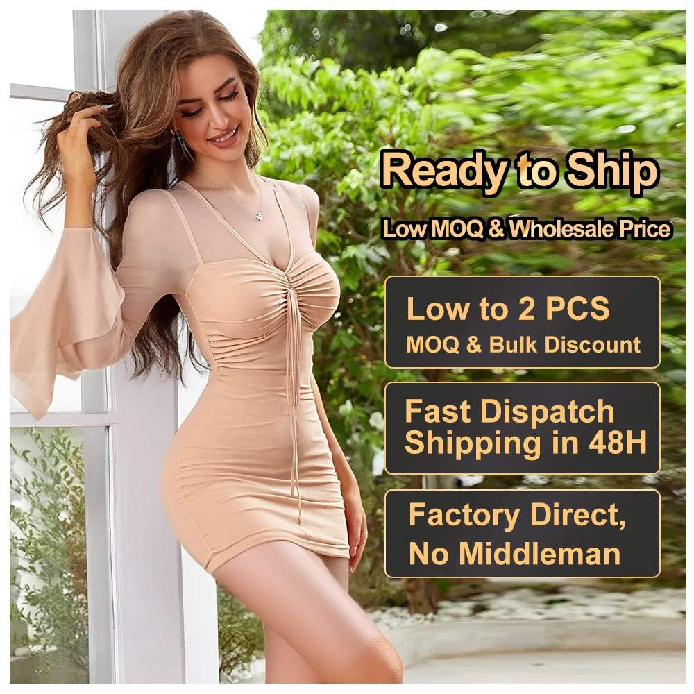 Custom Clothing Sexy V-neck Mini Dress Flared Long Sleeved Mesh Dress for Petite Women Autumn Bodycon Casual Dresses Wholesale