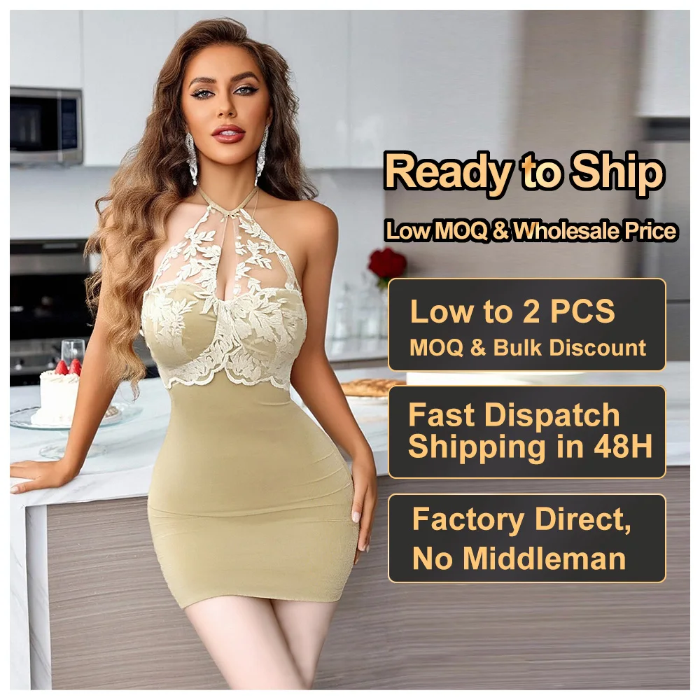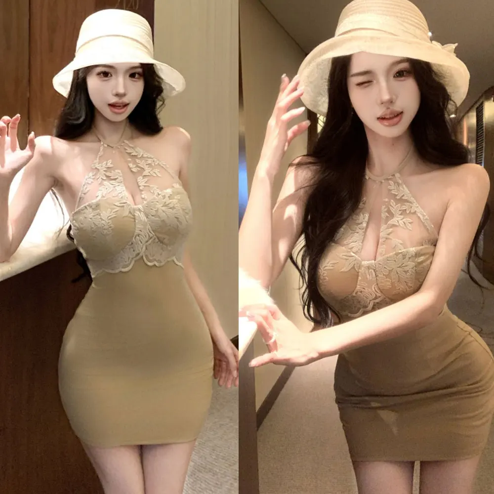 Wholesale Women's Beige Bodycon Lace Appliqued Dress Sexy Halter Neck Design with V Neck Custom Slim Fit Mini Dress for Women