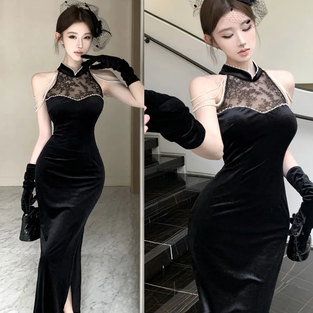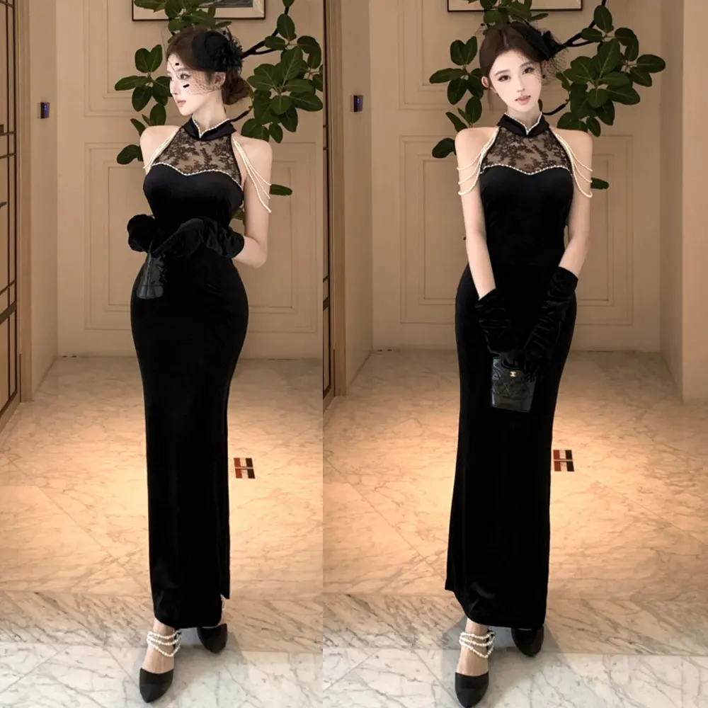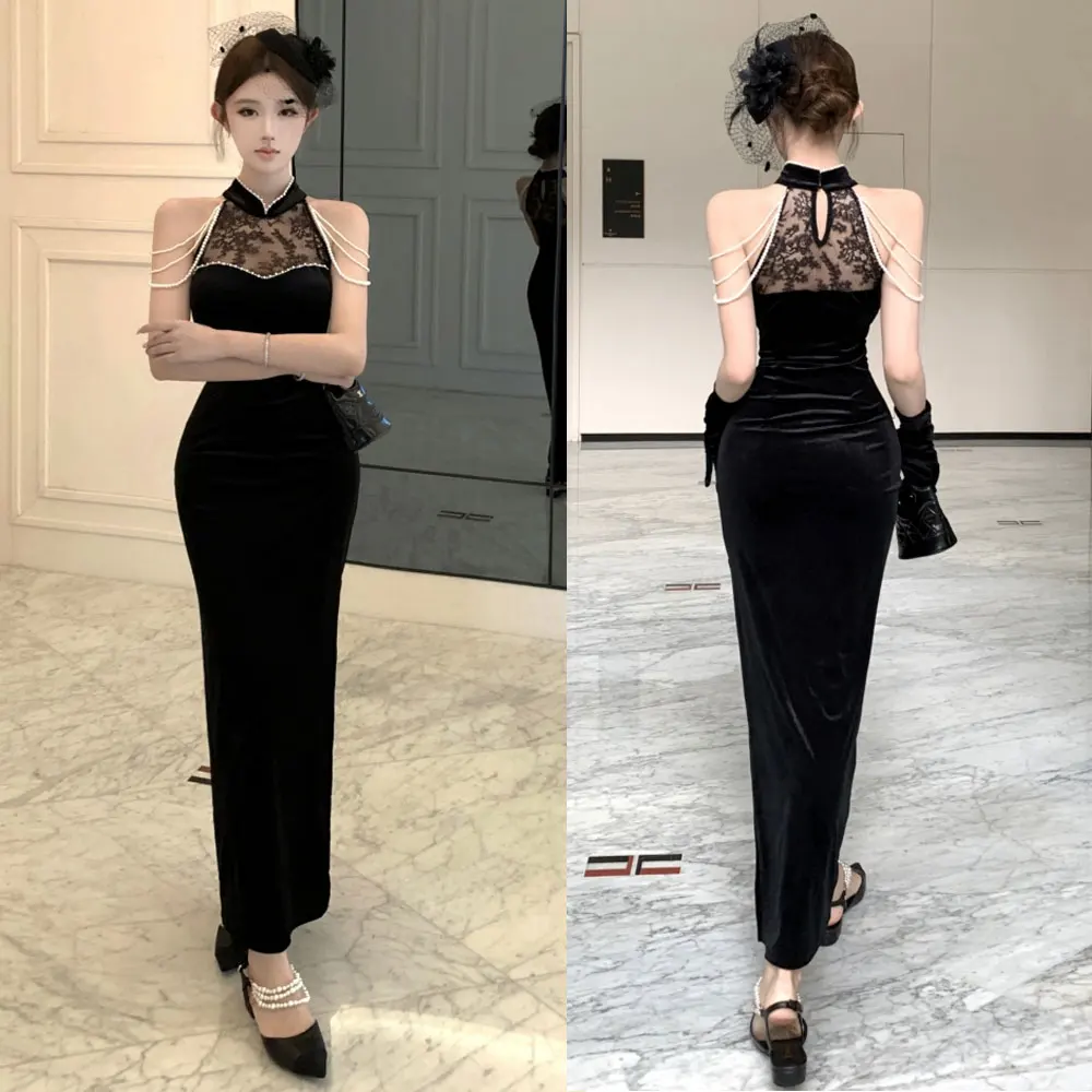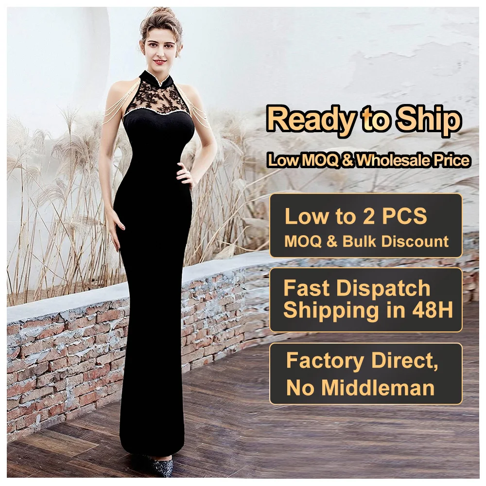 Luxury Women's Evening Dress Long Sleeveless Velvet Gown Elegant Bodycon with Lace Design Custom Wholesale ODM & Ready Stock
