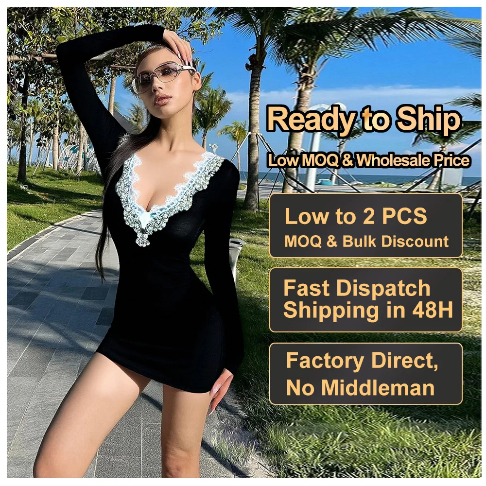 Wholesale Black Lace Trim Bodycon Dress for Women Elegant Sexy Deep V-Neck Customizable Design Party Mini Dress