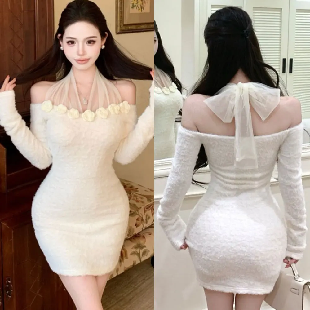 Wholesale Custom Mini Length Dresses for Women Clothing Floral Neckline Fuzzy Long Sleeves Ladies Elegant Women Casual Dress