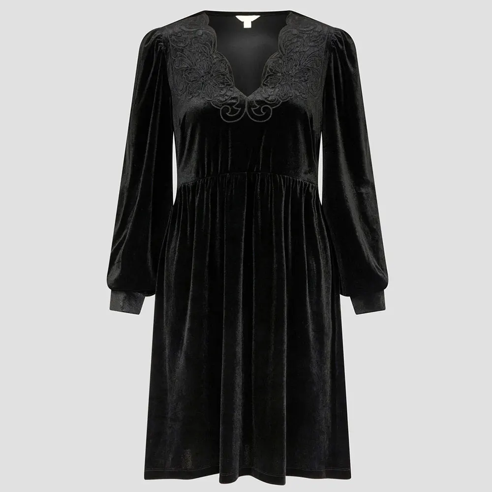 ZYHT 21938 Black Velvet Mini Dress Square Neck Long Puff Sleeves with Pearl Trim & Crystal Dess Flared Scalloped Hem Dresses