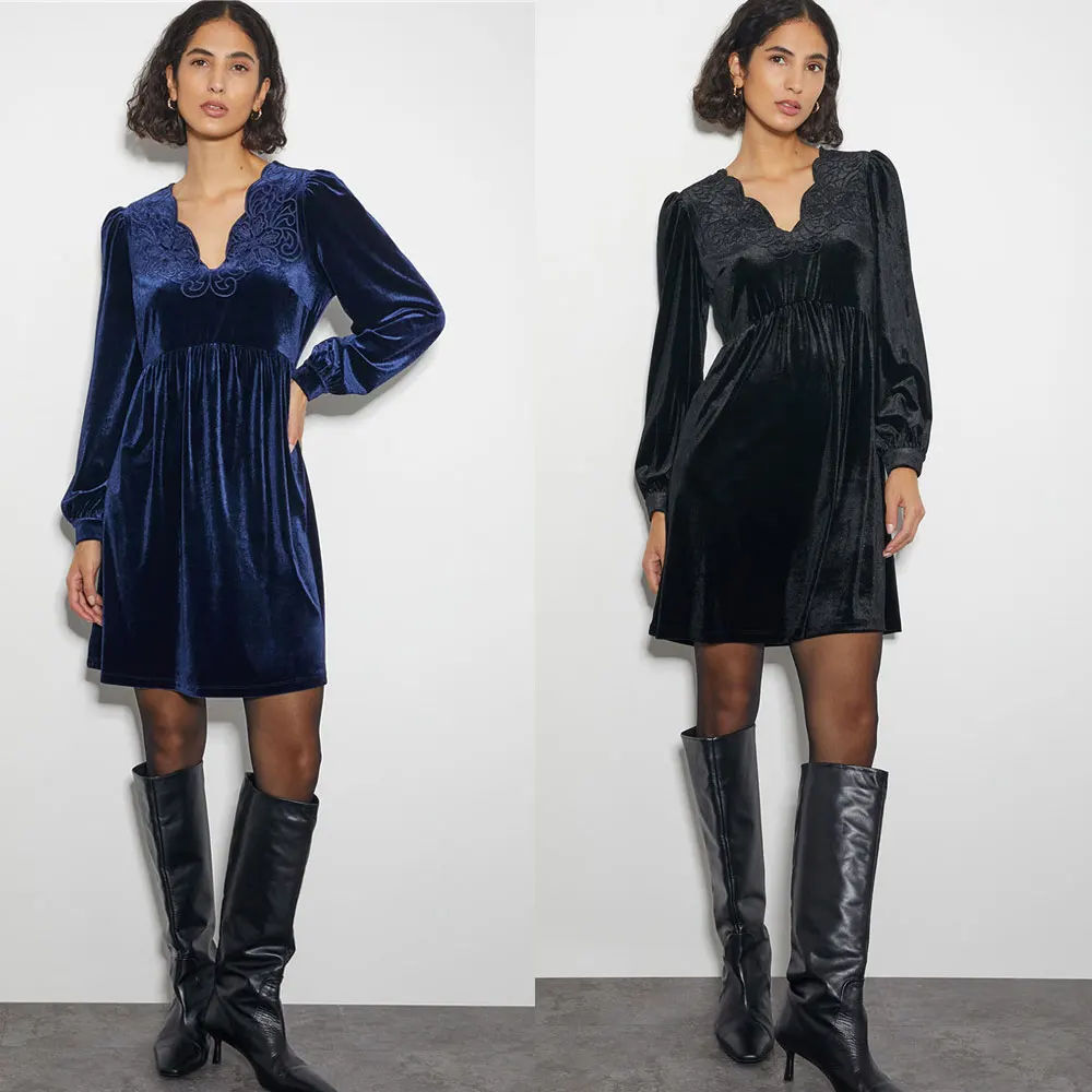 ZYHT 21541 Wholesale Crew Neck High Waist Casual Dresses Elegant Lace Velvet Mermaid Hem Ruched Long Sleeve Dresses for Women