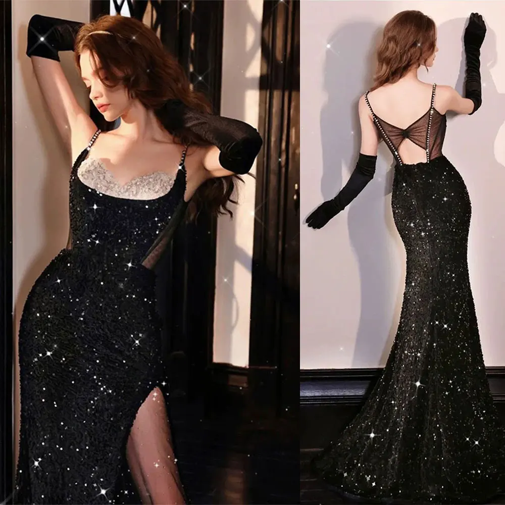 Wholesale Custom High Quality Suspender Sexy Sequins Starlight Black Slit Sexy Fishtail Temperament Evening Dress