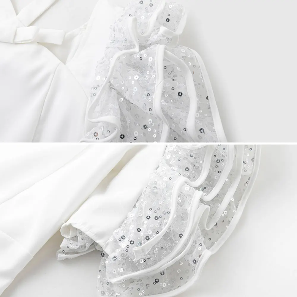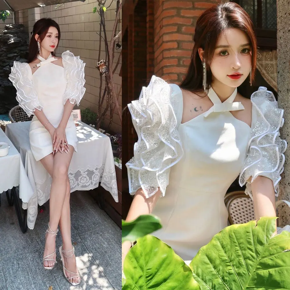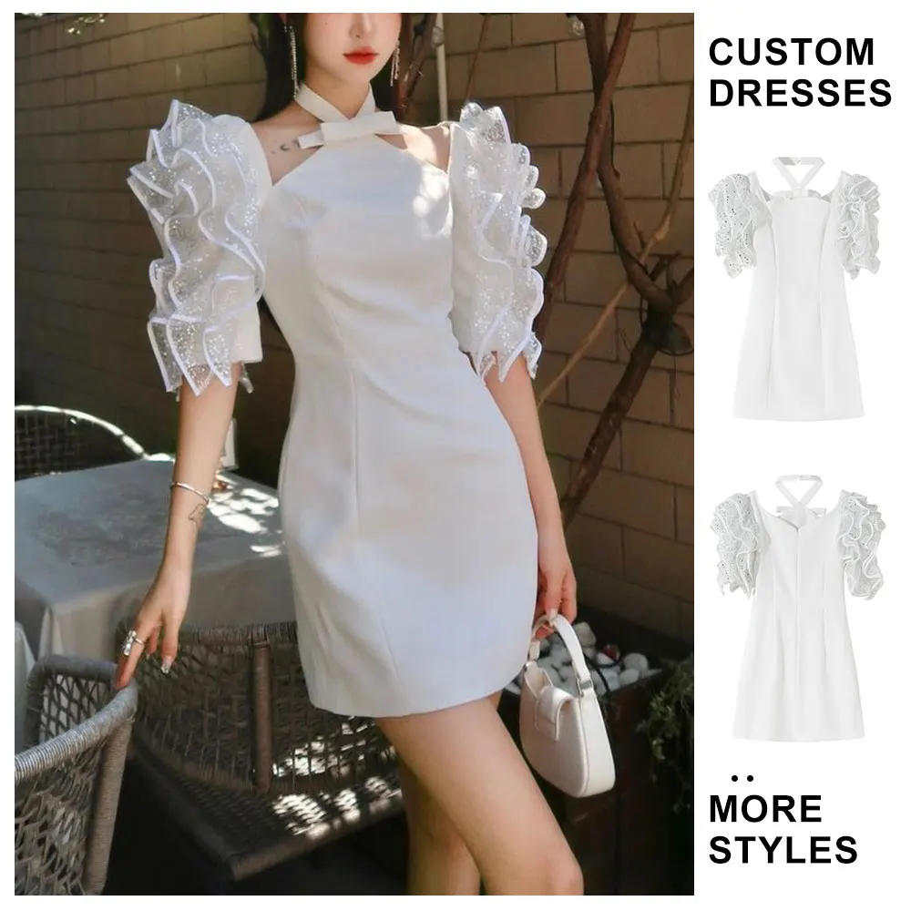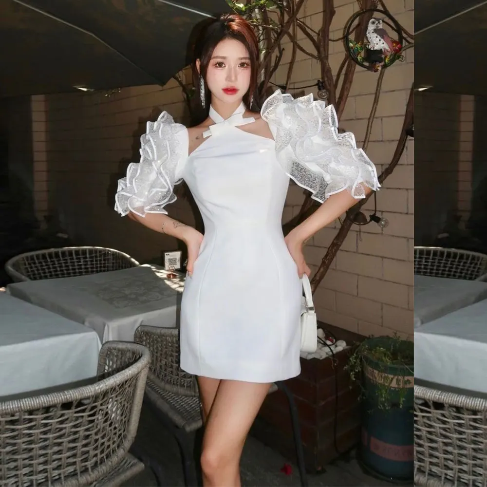 Custom Wholesale White Halter Neck Mini Short Dress Sequin 3D Flower Wrist Sleeve Elegant Girls Party Dresses