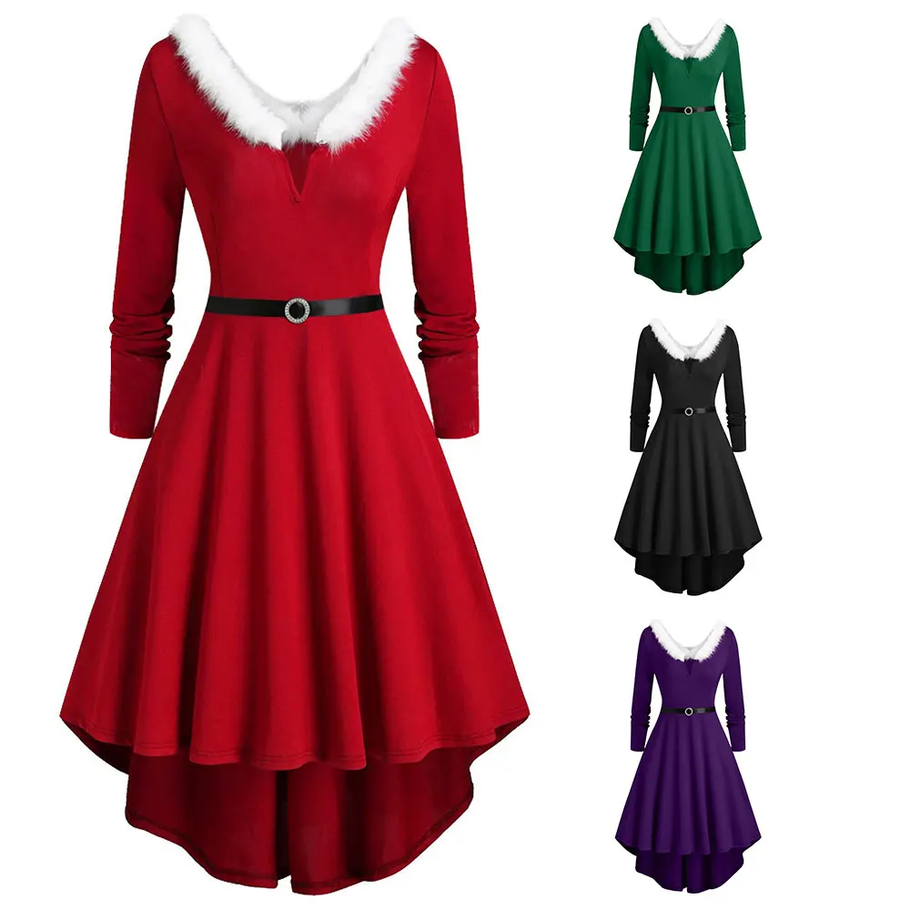 Custom Women's Red Vintage Christmas Party Pin Rockabilly Dress Long Robe with Knee-Length Long Sleeves V-neck Dress for Women