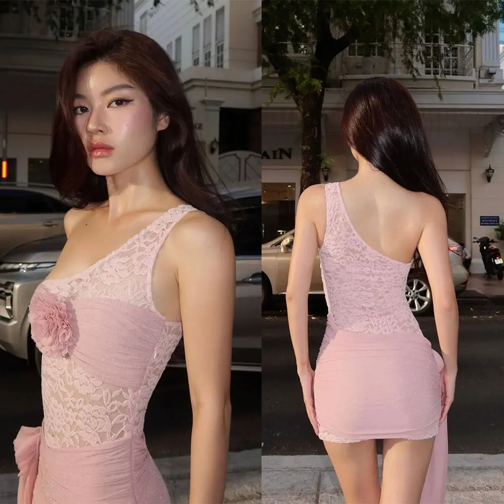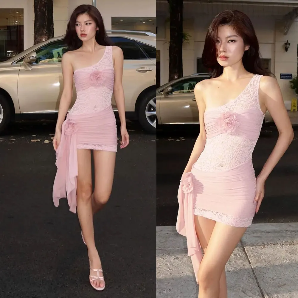 Elegant Modern One - Shoulder Pink Dress 3D Floral Applique Lace Panel Asymmetric Ruffle Hem Party Outfit
