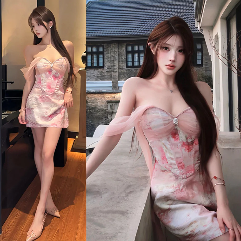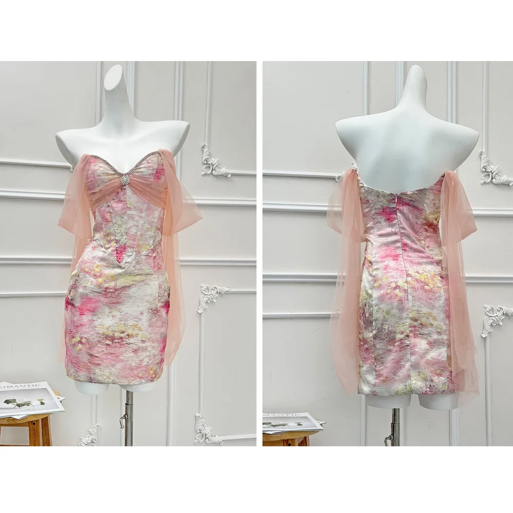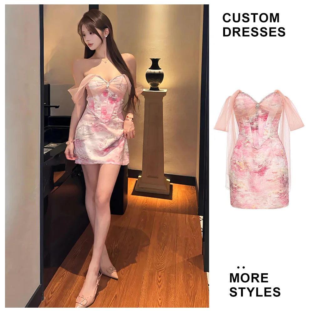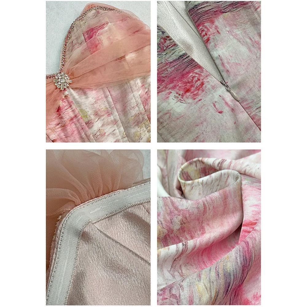 Custom Lady Fashion Casual Printed Chiffon Dress Pink Roses Mesh Midi Women Dress Ruched Decoration Natural Waistline
