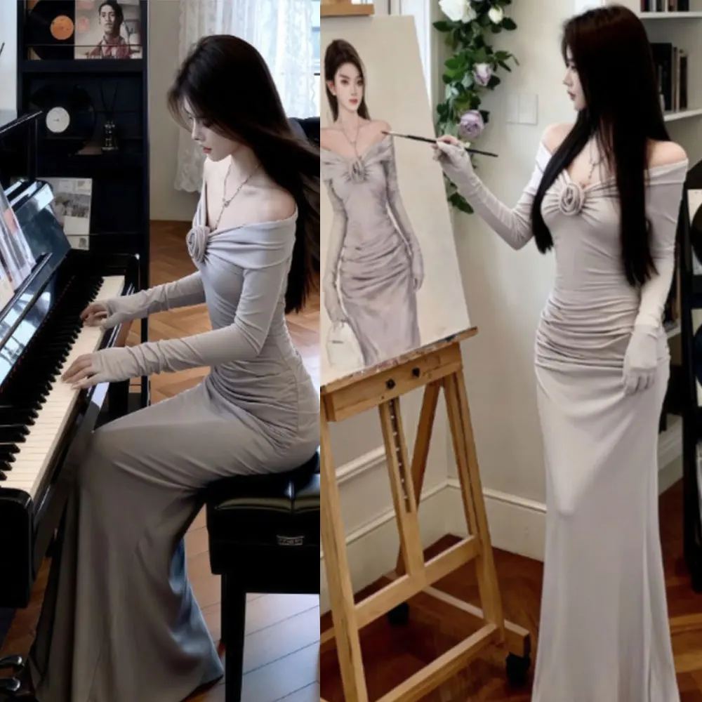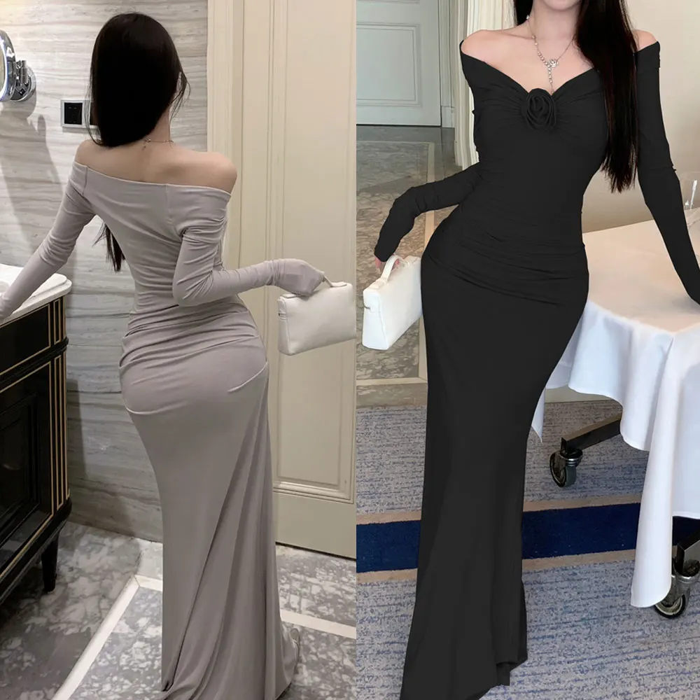 Custom Summer Long Dress Party Club Sexy Ladies Elegant Dress Off-Shoulder 3D Flower Design Slim Fit Bodycon Casual Dress