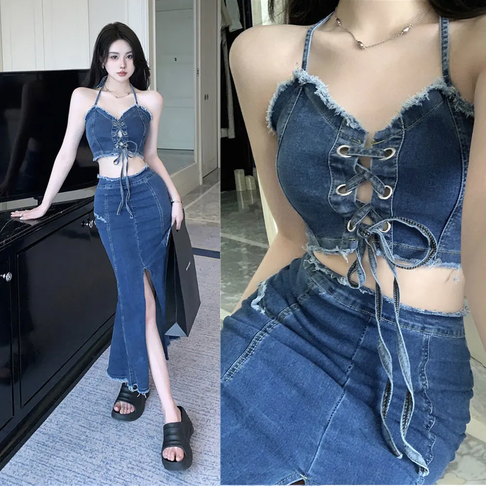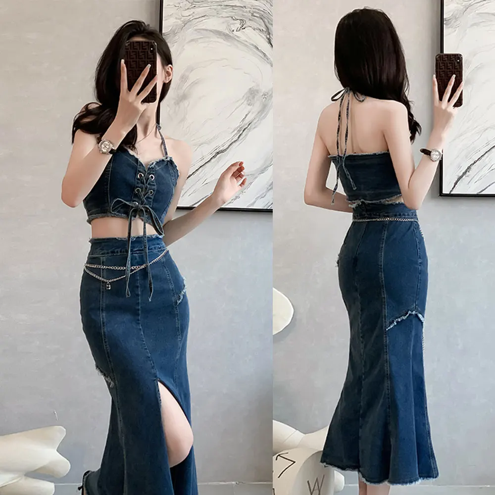 Custom Denim Dress Two Piece Set V Neck Lace up Crop Top and Split Floor-Length Skirt Casual Outfits Sexy Slit Women's Skirts
