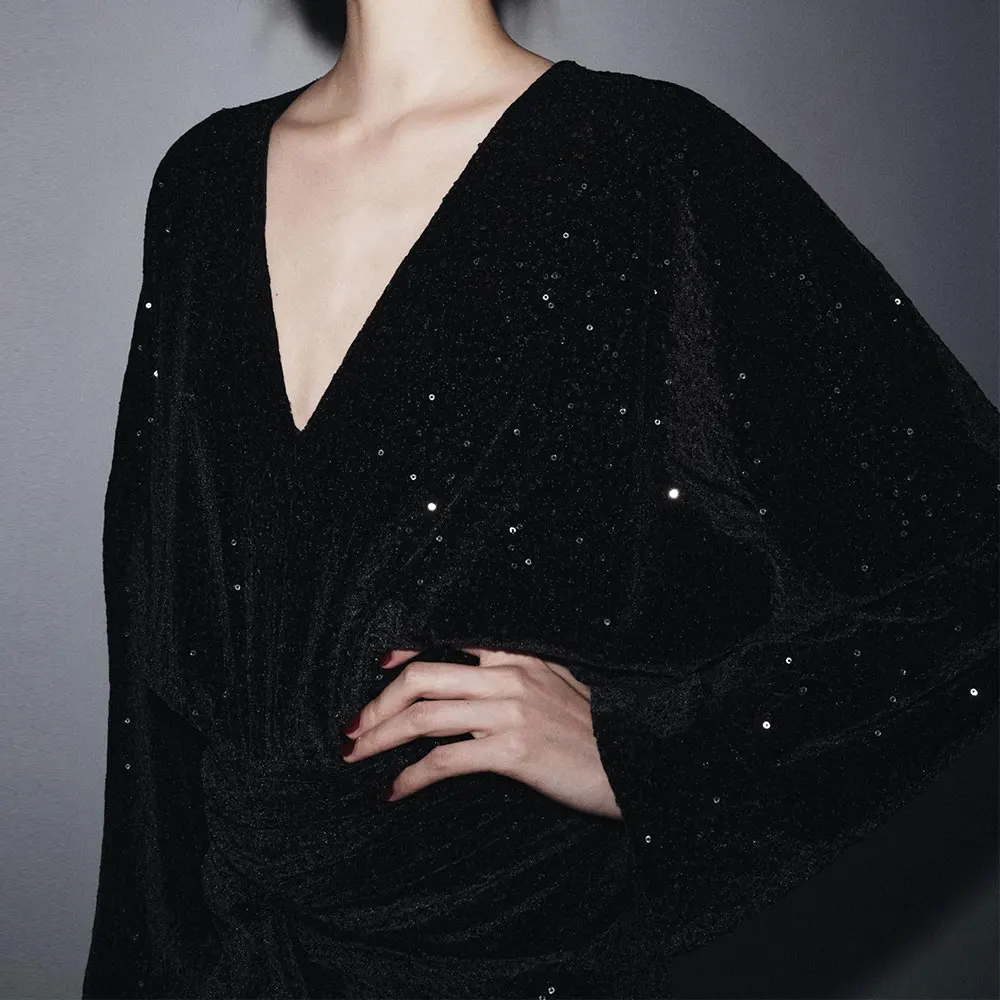 Custom Winter New Arrival Women's Deep V Neck Long Sleeve Pleated Waist Sequins Velvet Black Elegant Sexy Dress Popular
