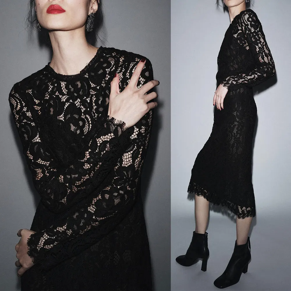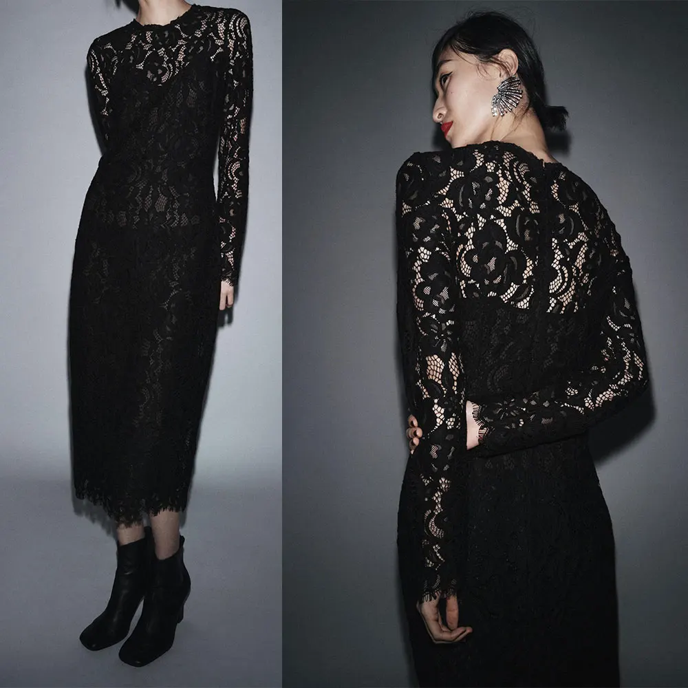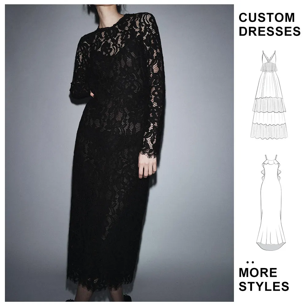 Custom Ladies Black Sexy Lace Dresses Women Round Neck Long Sleeve Slim Long Dresses Anti-Static Women Elegant Edition Dresses