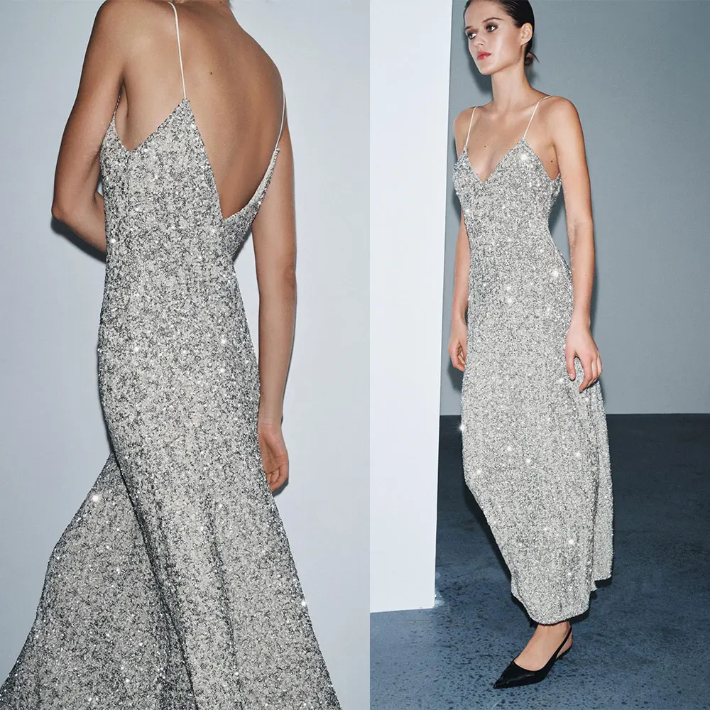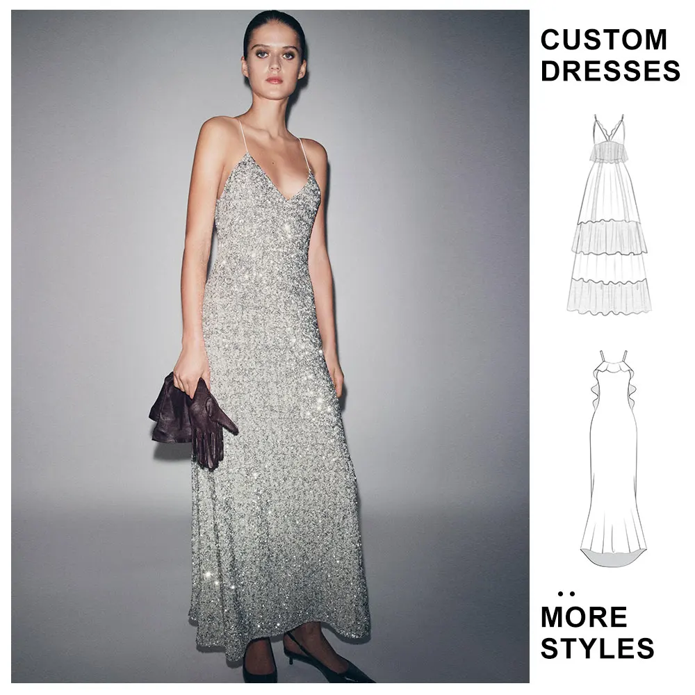 Custom Fashion Maxi Dress for Ladies New Design Sleeveless V-Neck Casual Glitter Sequin Evening Party slip Long Dress for Women
