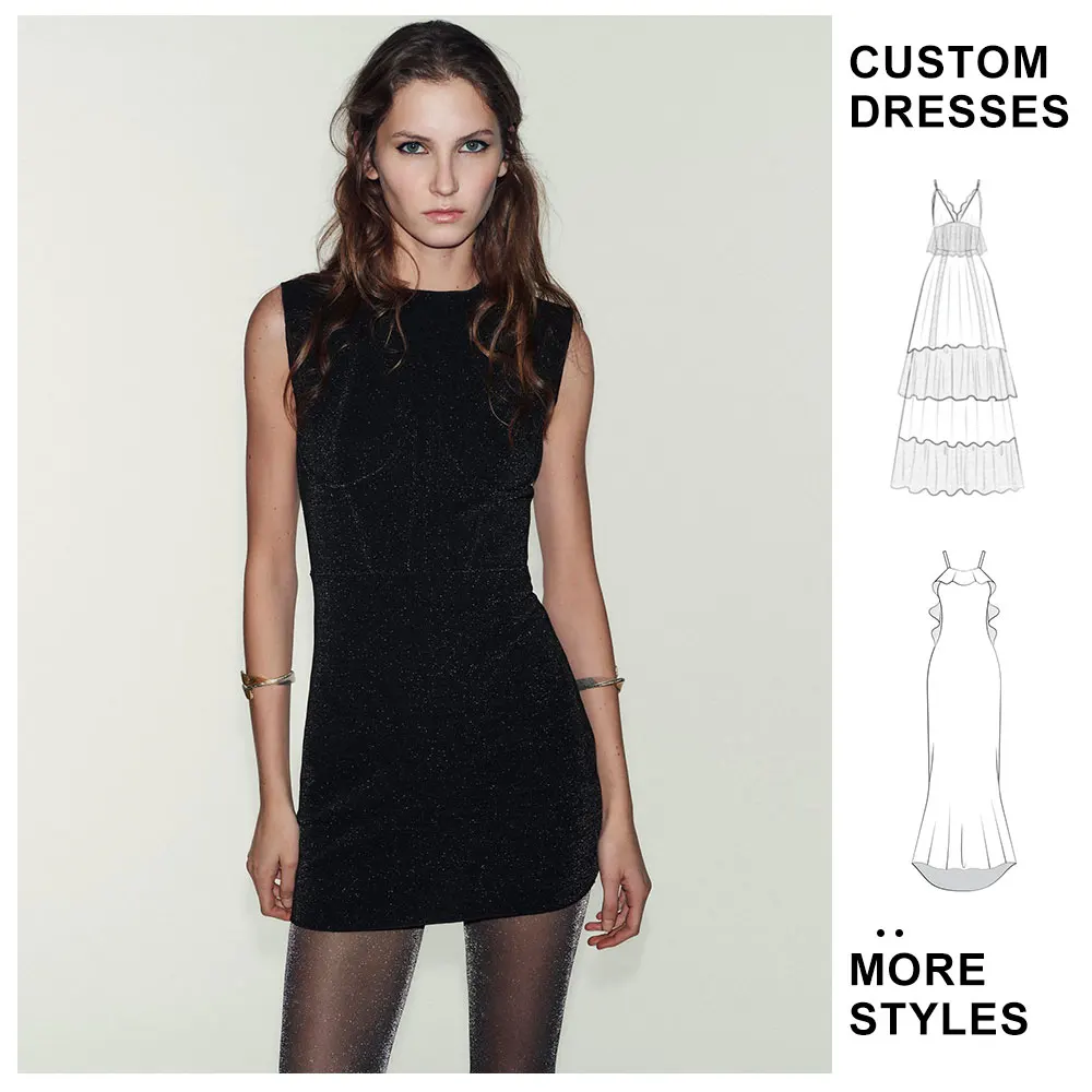 Custom OEM Women's Crew Neck Sleeveless Mandarin Collar Anti-Static Shiny Stretch Black Casual Mini Short Dress for Women