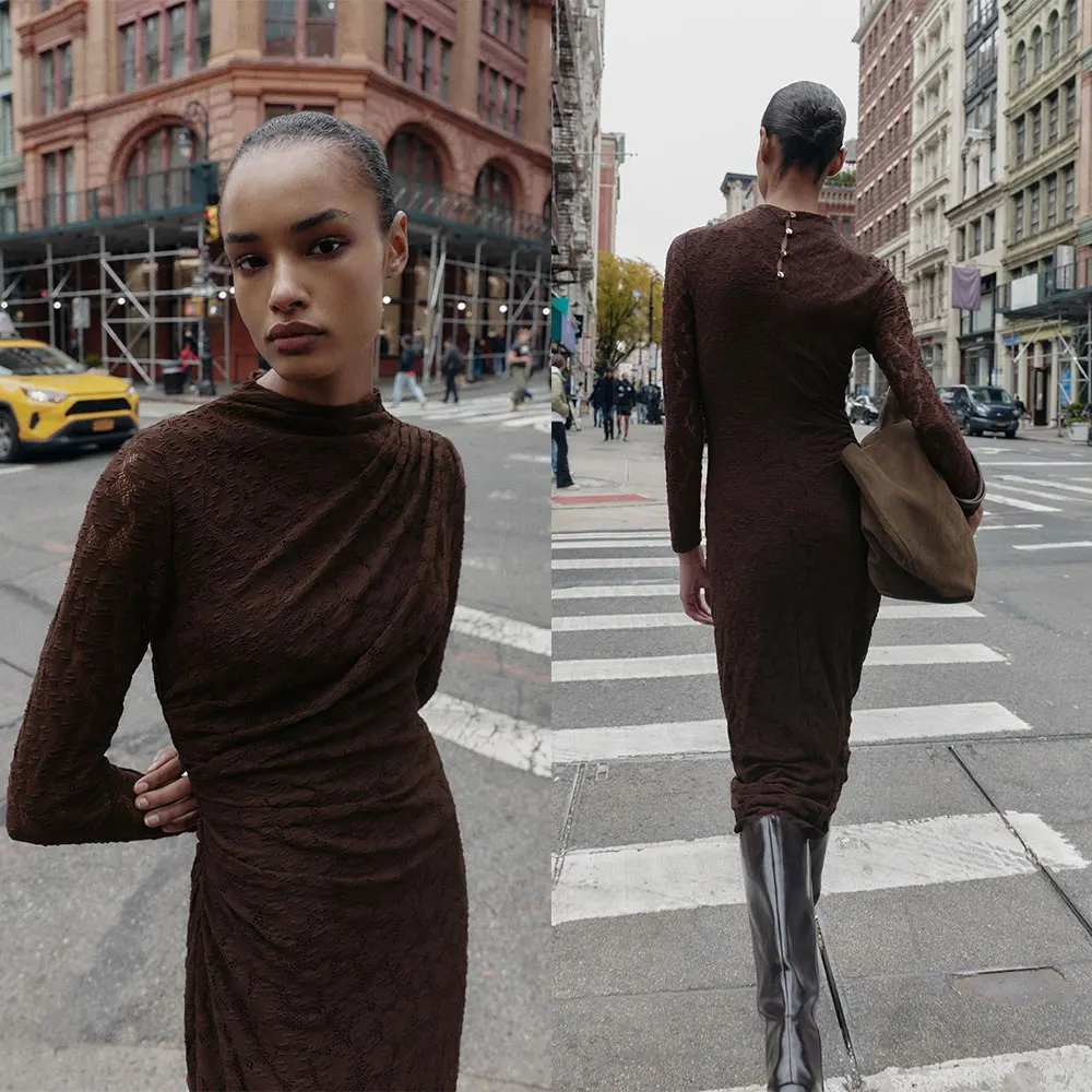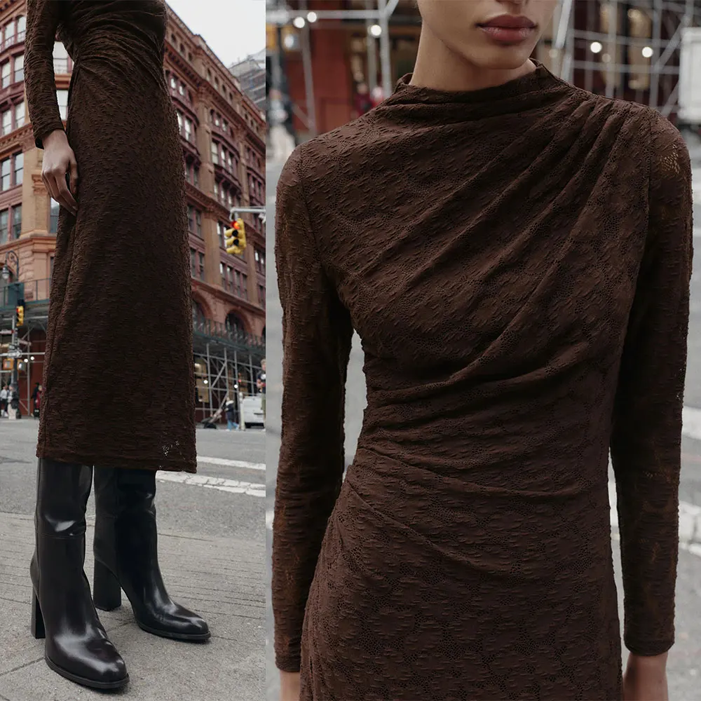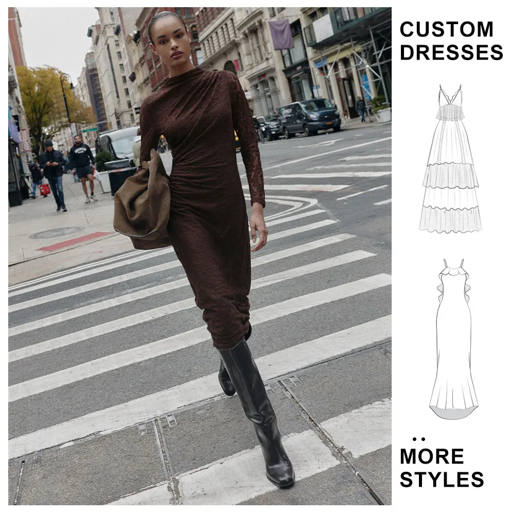 Custom Wholesale Winter New Women's Maxi Dresses Spaghetti Strap Luxury Brown Long Sleeve Ruched Lace Ladies Dress