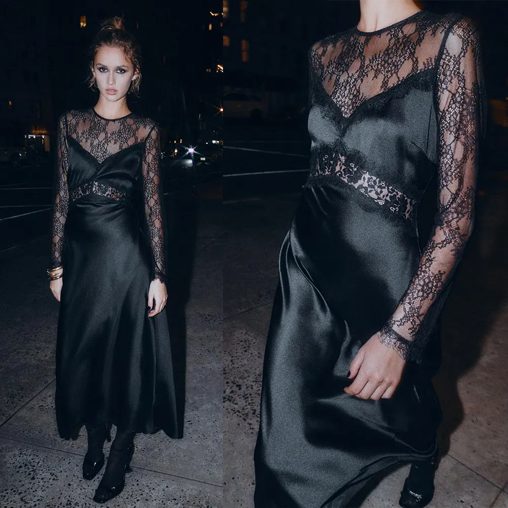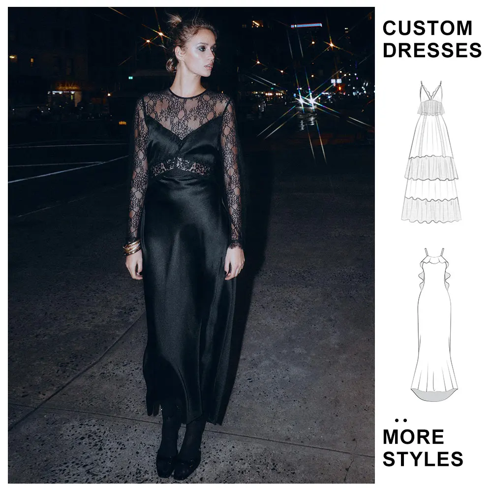 Custom 2025 Winter New Women's Round Neck Long Sleeve Lace Splicing Bodycon Long Sleeve Elegant Dress Evening Dress