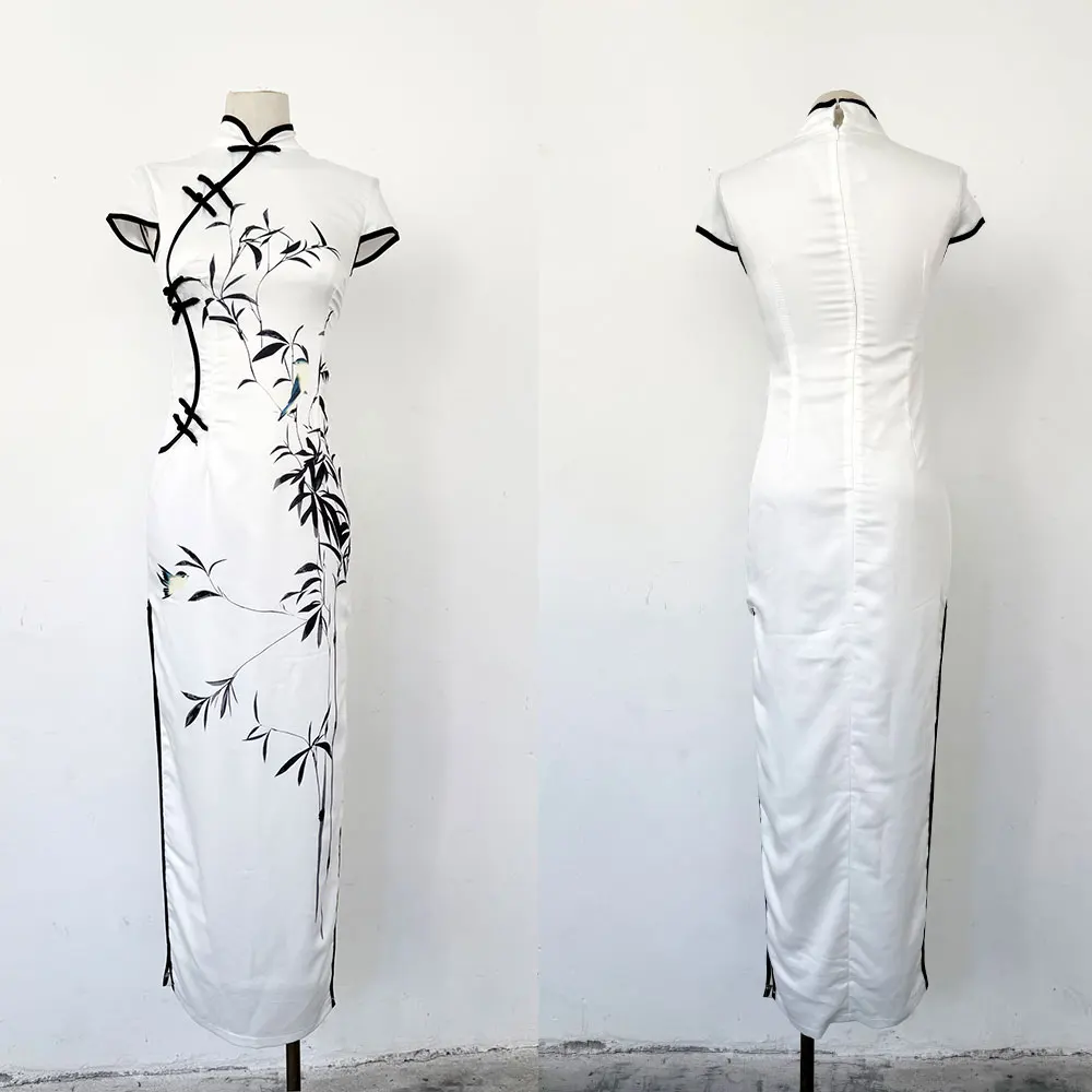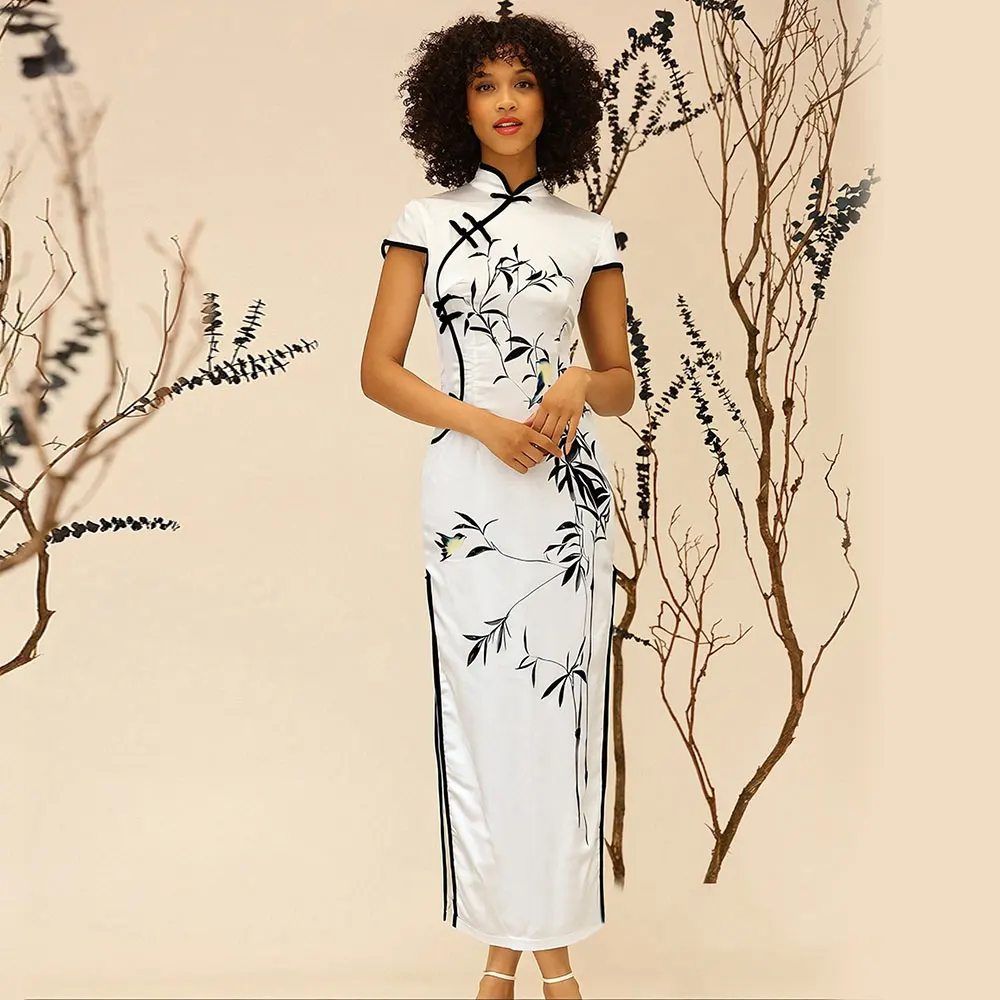 Custom OEM White Qipao Wholesale Elegant Women Short Sleeves Printing Maxi Dress for Luxury Women Clothing Bulk Order Dresses