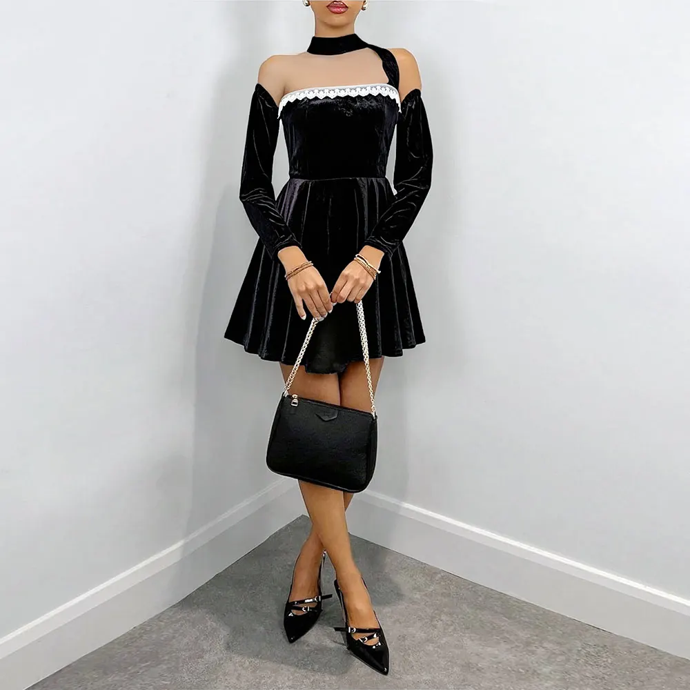 ZYHT 15325 Wholesale Spring Trendy Fashion Long Sleeve Dinner White Lace Black Velvet Elegant Party Dress Women Evening Dresses