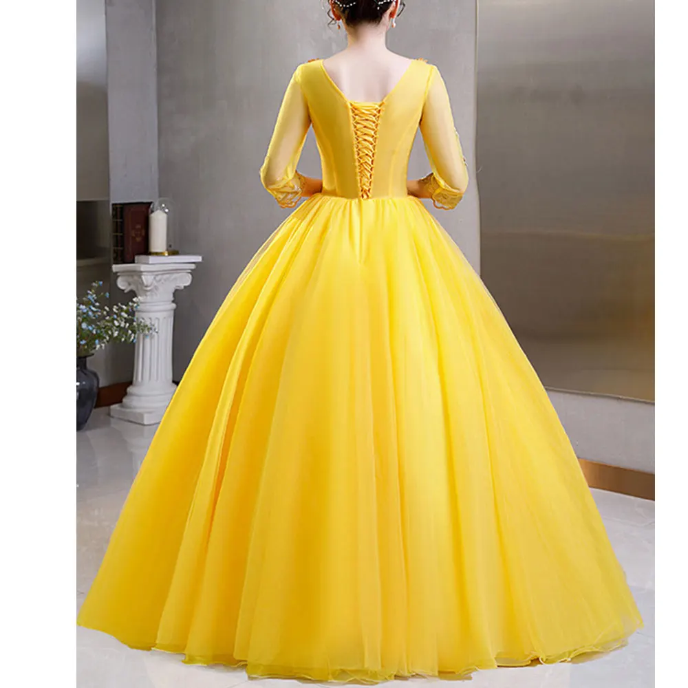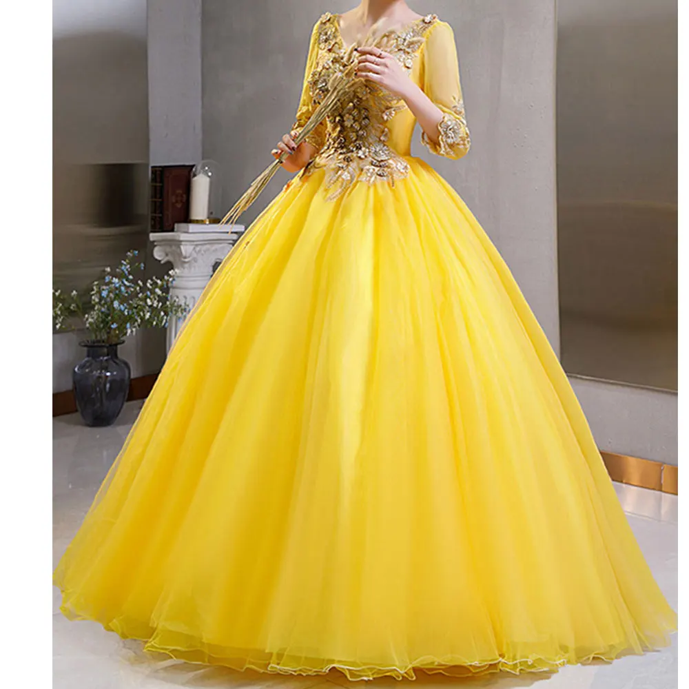Custom Wholesale Latest Lady Host Yellow Rhinestone Performance Stage Dress Yellow 3/4 Sleeves Lace Long Length Evening Gowns