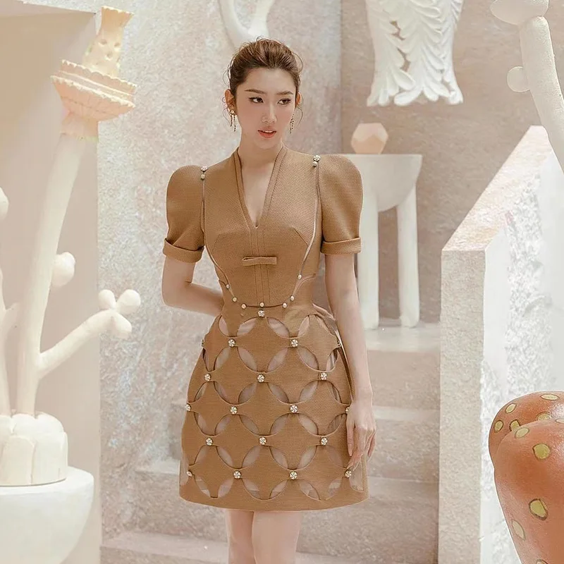 Custom New Design Casual Dresses Fashion Elegant High Quality Dress Short Sleeve V Neck Summer Beaded Cutout Short Women Dress