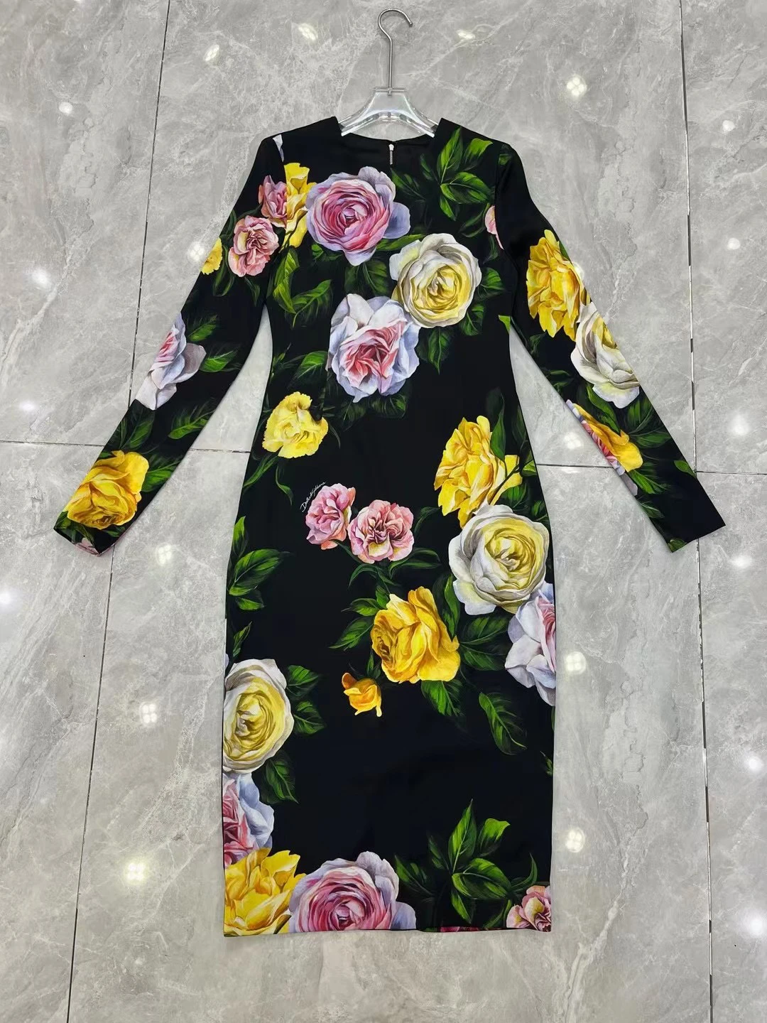Custom Bodycon Dress 2025 Spring Summer Party Event Women Vintage Floral Print Long Sleeve Midi Pure SIlk Dress Long Sleeve