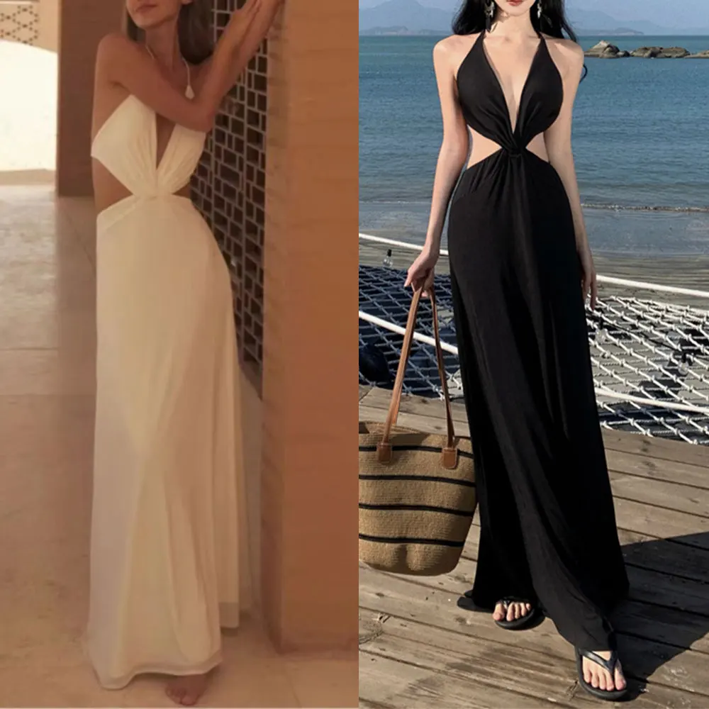 Custom OEM Women's 2025 Spring Chic Fashion Vintage Sleeveless Backless Halter Dress Casual Female Vestidos Mujer for Summer