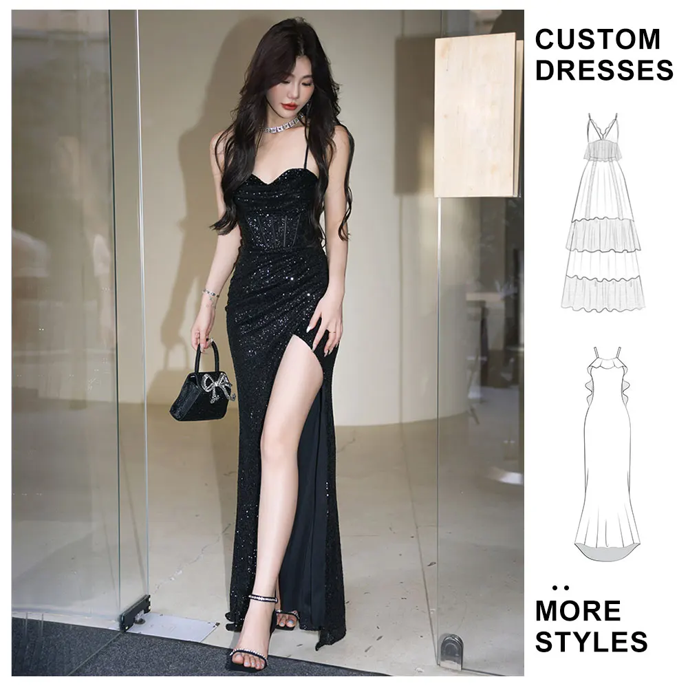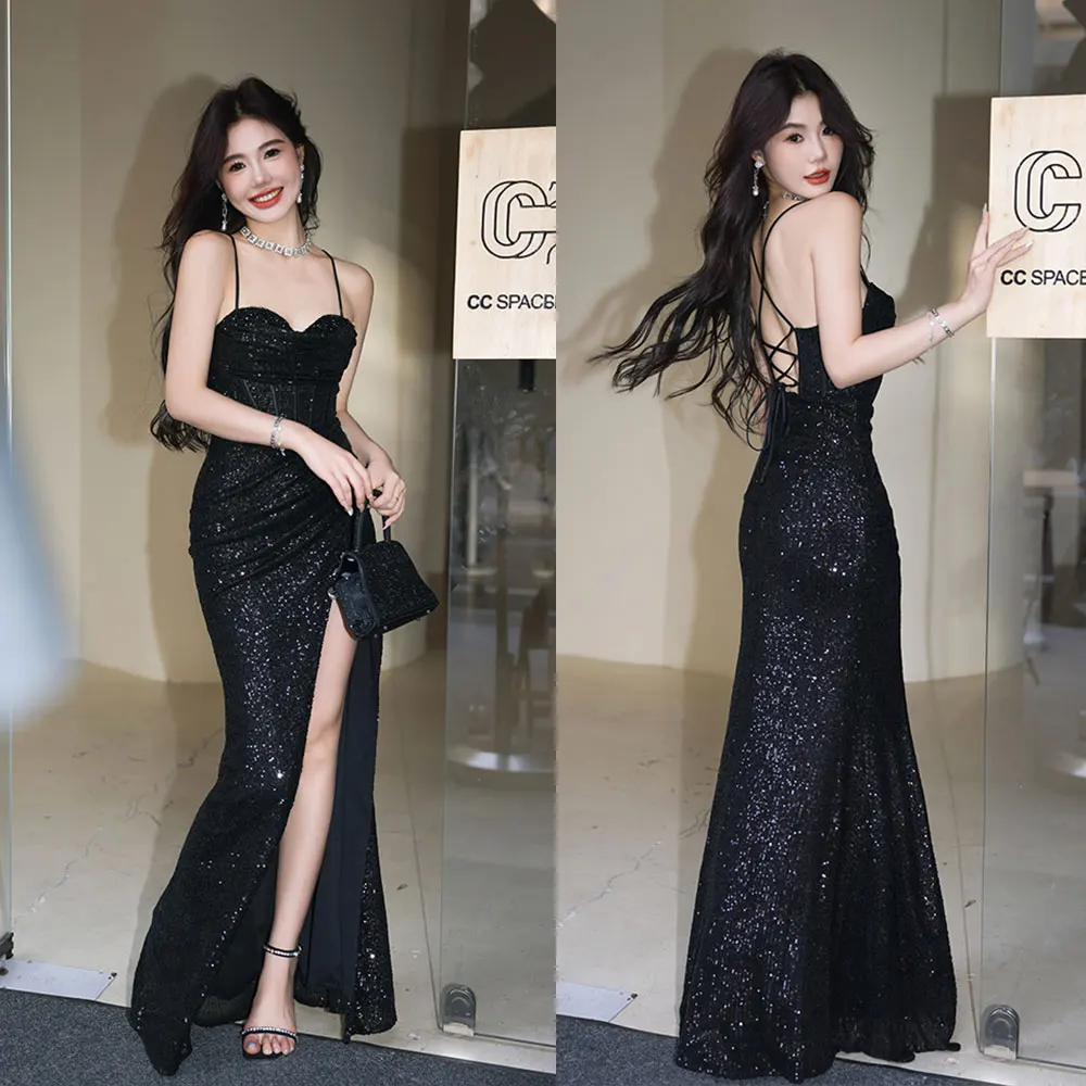 Wholesale Fashion Spaghetti Strap Bright Silk Maxi Sequins Dress High Slit Sexy Dress Club Night Party Evening Dresses Women