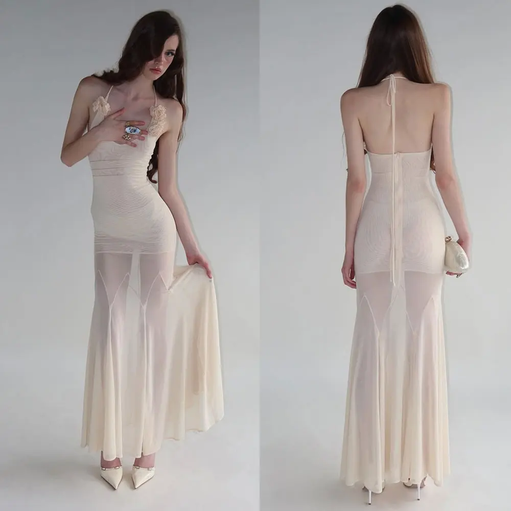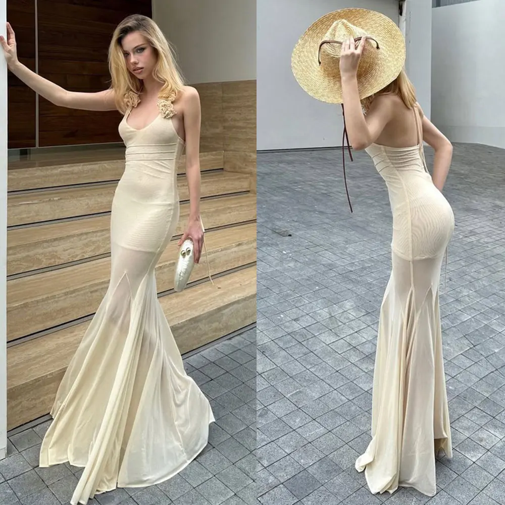 Custom 2025 Summer New Women's Elegant Strap Sexy Tie Flower Slimming Lace Tight Hanging Neck Vacation Party Women Maxi Dress