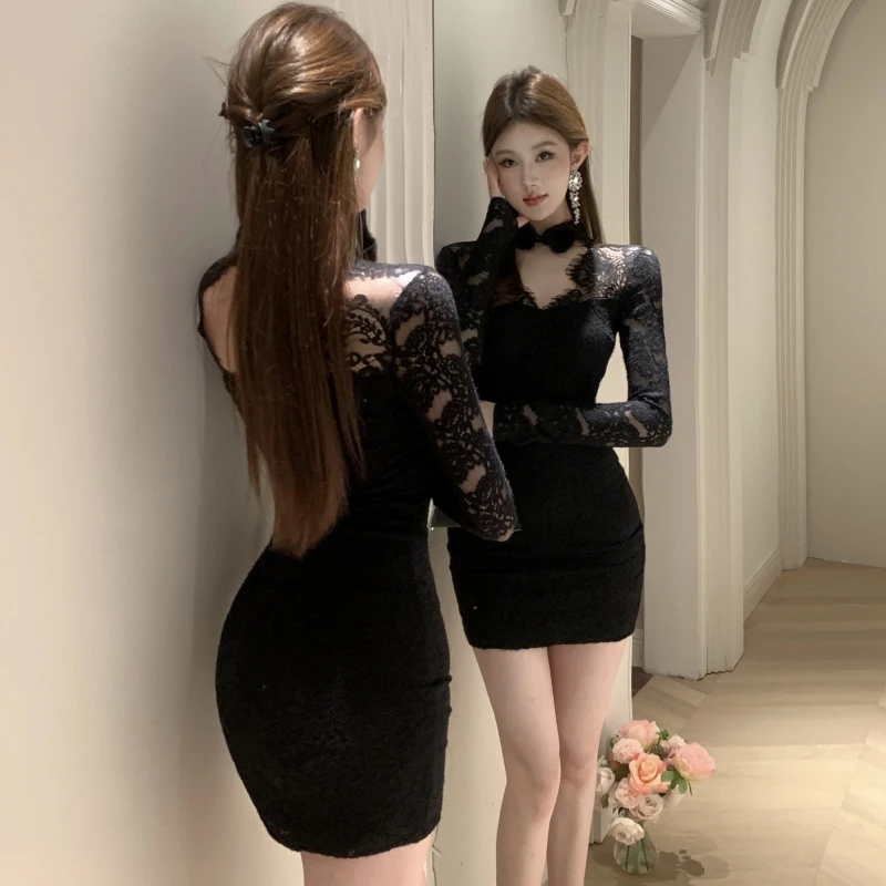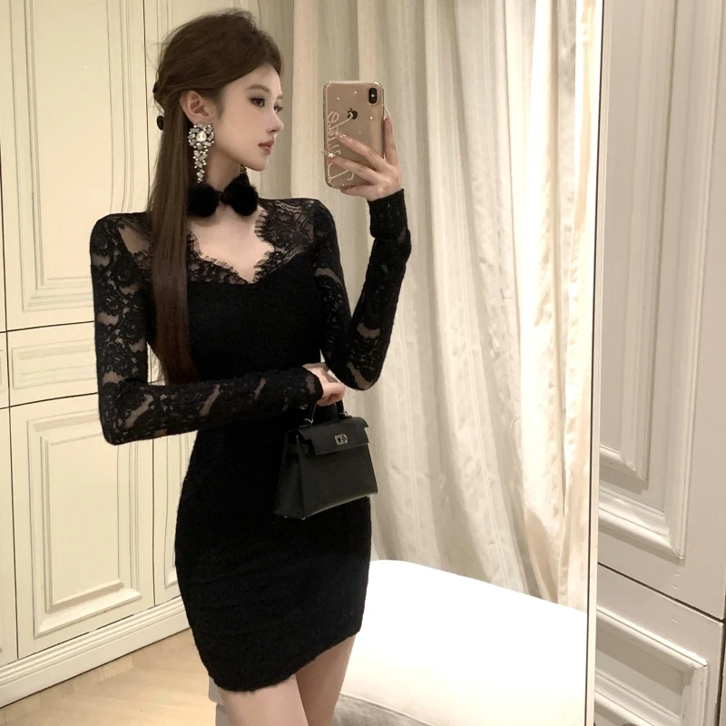 Women's Elegant Short Hip Dress with Chinese Collar Long Sleeves Lace Chic Casual for Autumn and Winter Season