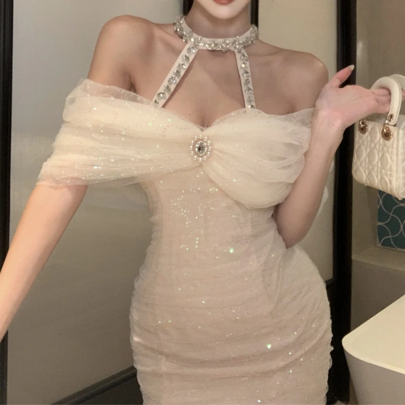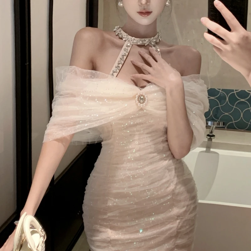 Women's Elegant Modern Empire Evening Dresses Sexy Tight Fit Solid Color Mini Clothing New Fashionable Halter Beach Spangle