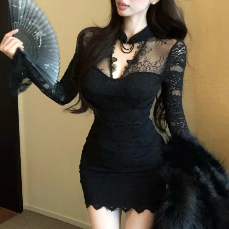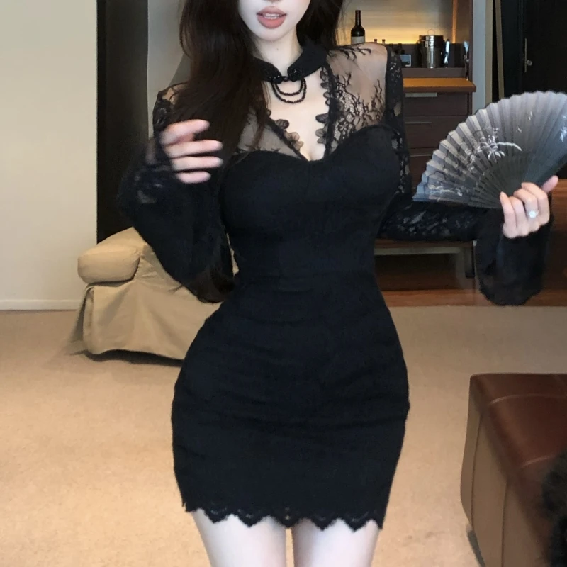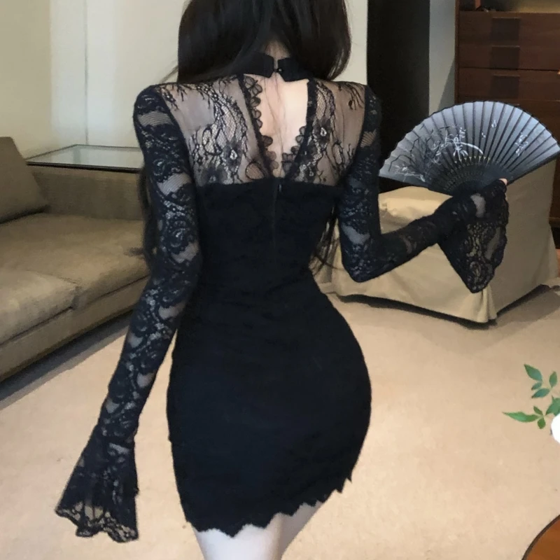 Women's Eco-Friendly V-Neck Joker Mini Dress Long Sleeve Black Sanding Lace with Horn Cuff Casual Style