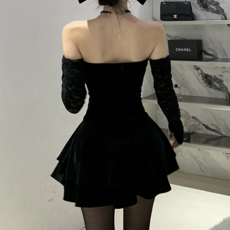 This Black Strapless Sleeveless Dress with Lace - up Corset Detailing and a Flared Skirt Creates a Chic and Elegant Gothic Look