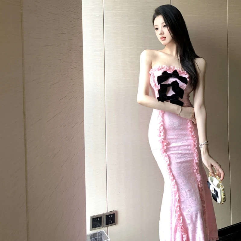 Pink Strapless Mermaid - Style Dress with a Large Black Bow and Ruffled Details Creates a Sweet and Elegant Look Perfect