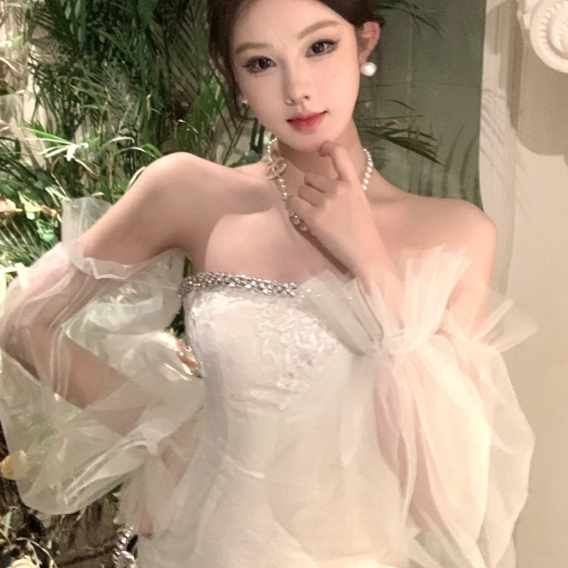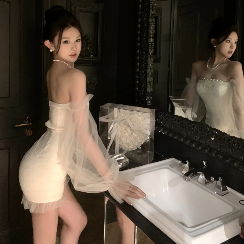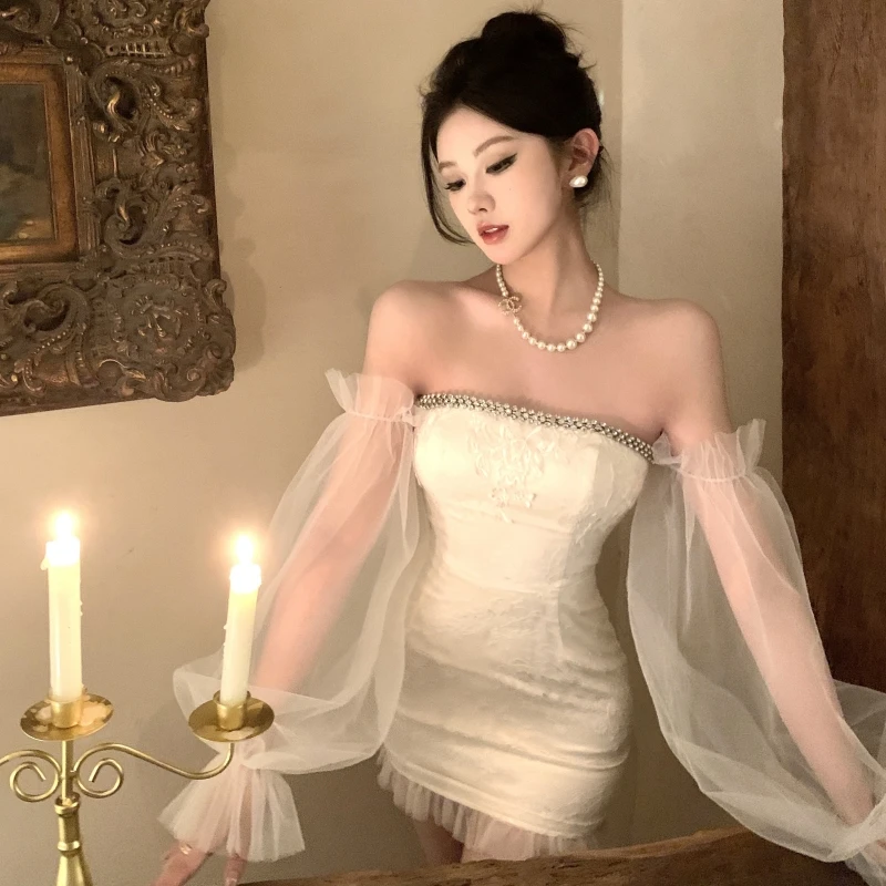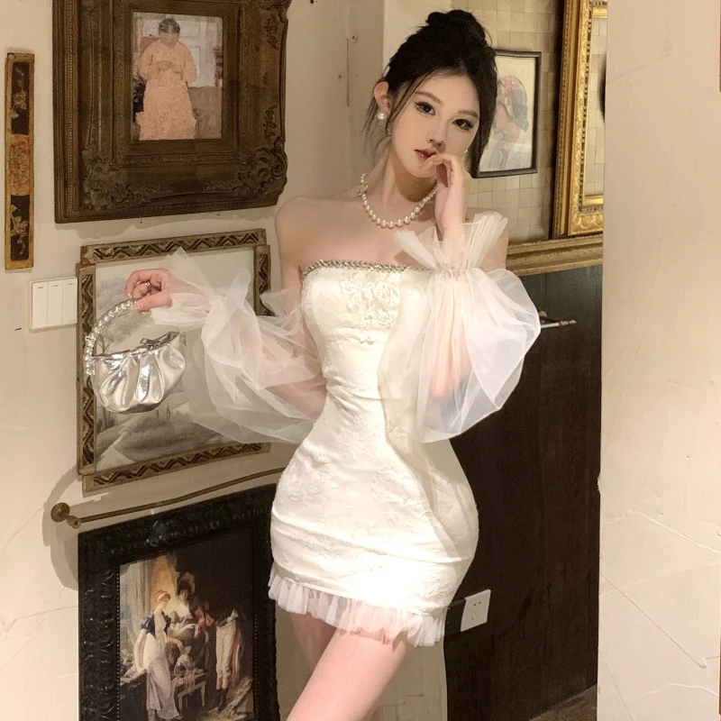 Strapless Bodycon Dress with Tulle Puff Sleeves and a Sparkling Embellished Neckline Creates a Dreamy and Elegant