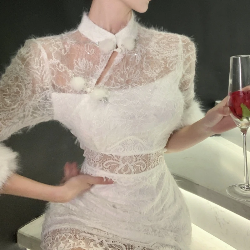 ZYHT 15325 Wholesale Spring Trendy Fashion Long Sleeve Dinner White Lace Black Velvet Elegant Party Dress Women Evening Dresses