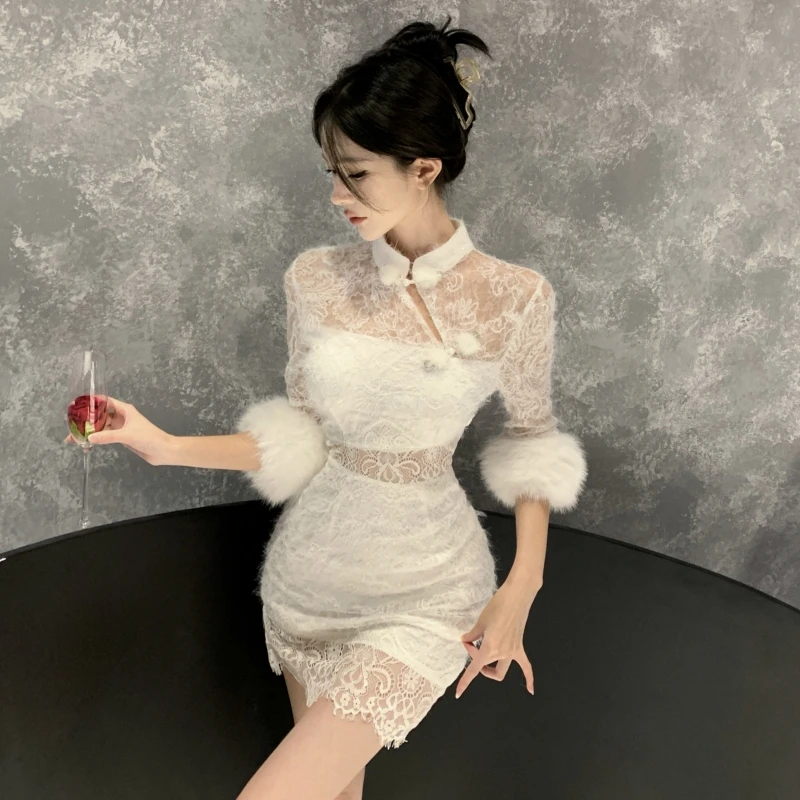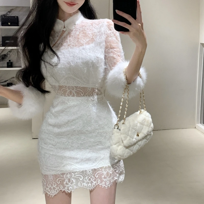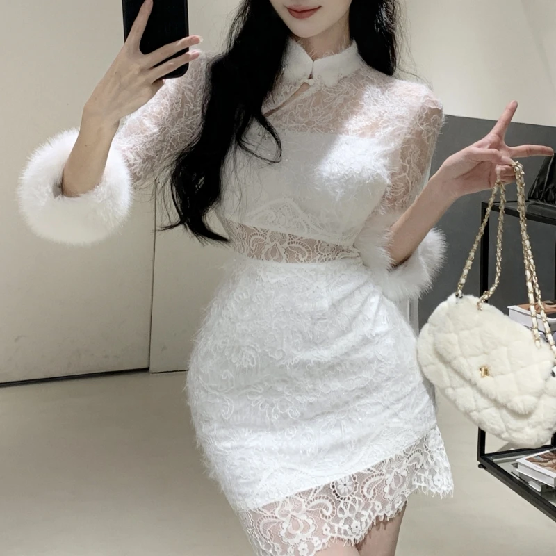 ZYHT 21541 Wholesale Crew Neck High Waist Casual Dresses Elegant Lace Velvet Mermaid Hem Ruched Long Sleeve Dresses for Women