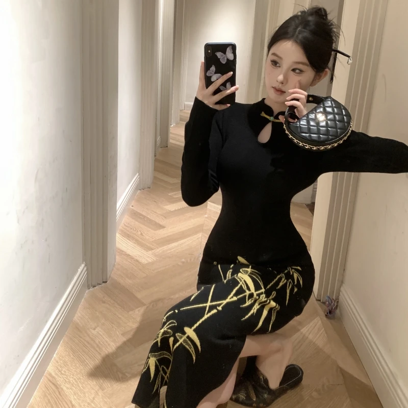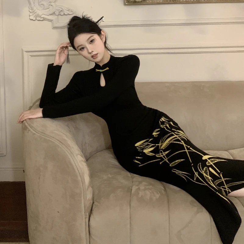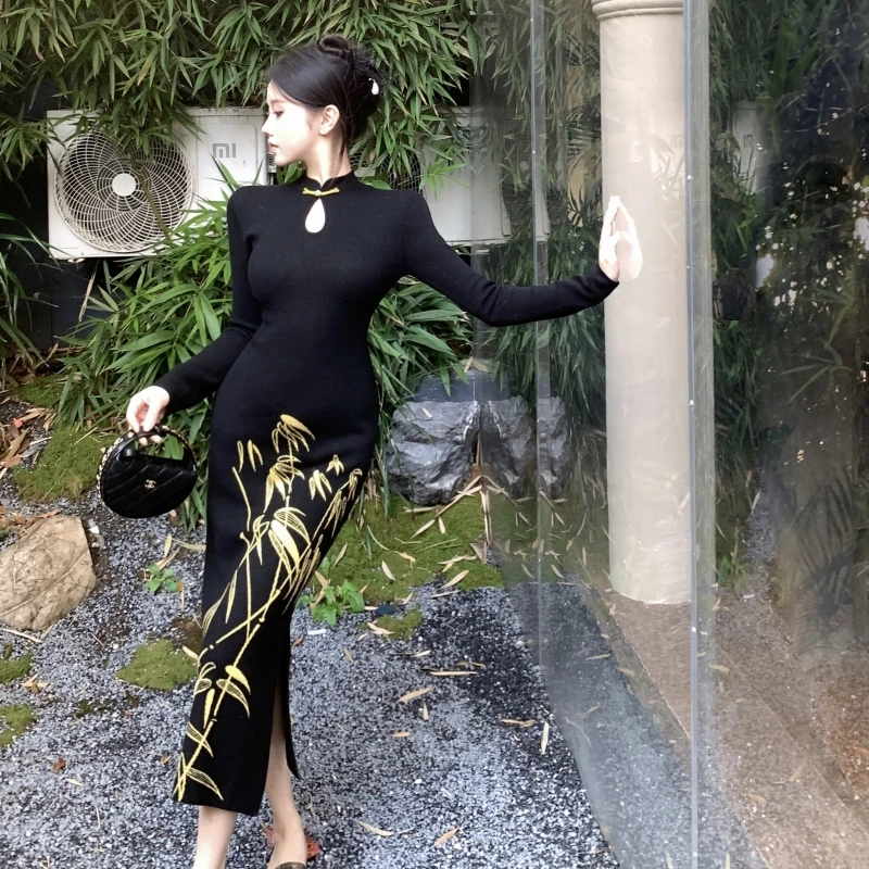 Long Sleeves Features Golden Bamboo Patterns and a Keyhole Neckline Creating an Elegant and Traditional Chinese - Style Look