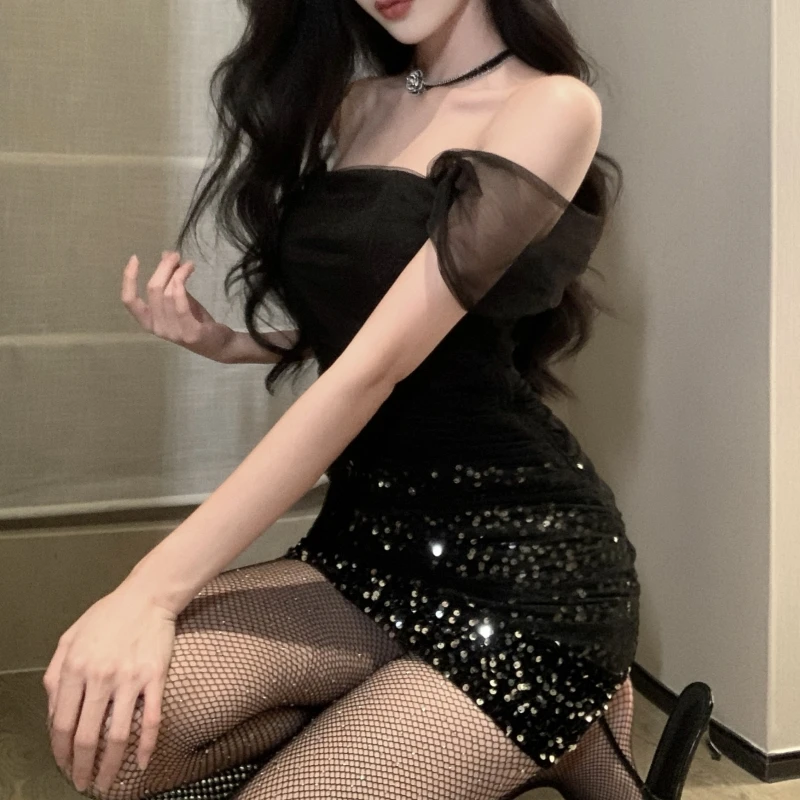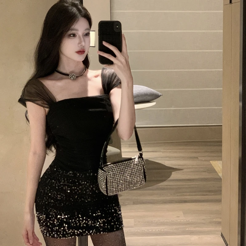 Dress with a square Neckline and a Sequined Skirt Creates a Glamorous and Stylish Look Perfect for Parties and Dance Outs