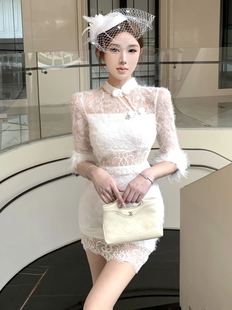 Delicate Lace Fabric Fluffy Cuff Dress with Three-Quarter Sleeves Elegant Traditional Modern Casual Style