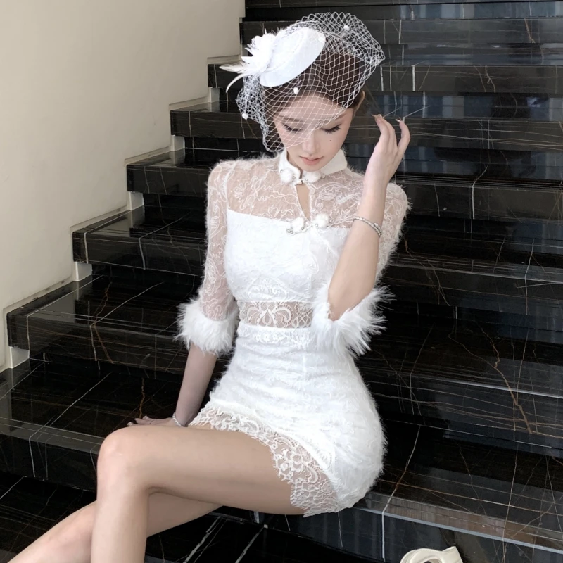 ZYHT 15325 Wholesale Spring Trendy Fashion Long Sleeve Dinner White Lace Black Velvet Elegant Party Dress Women Evening Dresses