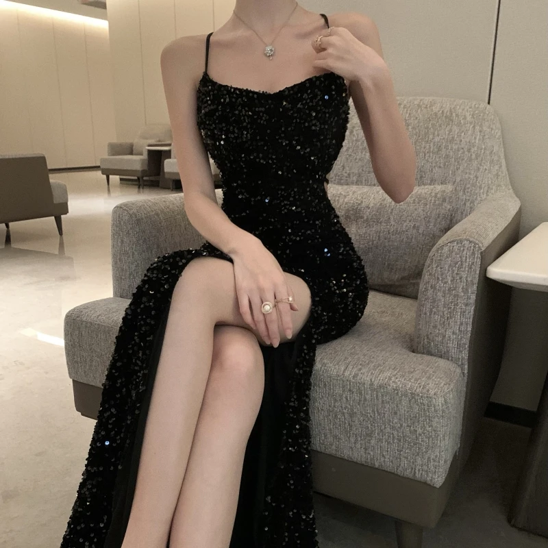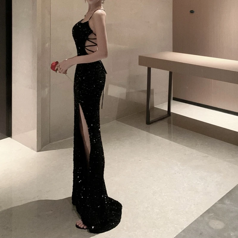 Glamorous Modern Spaghetti - Strap Black Sequin Gown with High Slit Bodycon Fit Stylish Evening Outfit