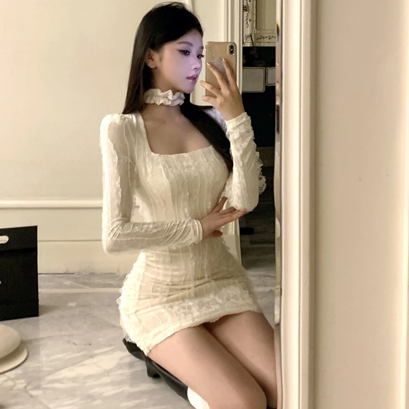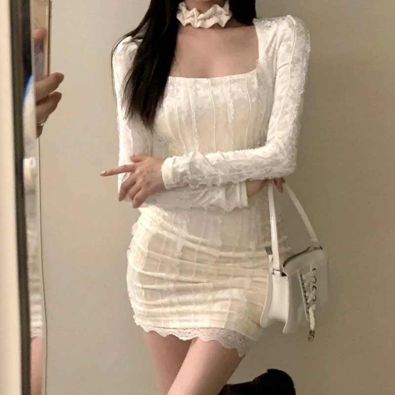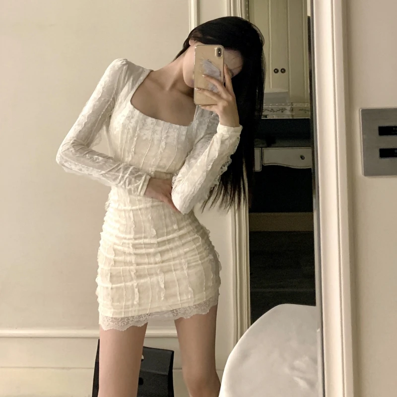 Long - Sleeve Bodycon Dress with a square Neckline and Lace Details Creates an Elegant and Romantic Look Suitable