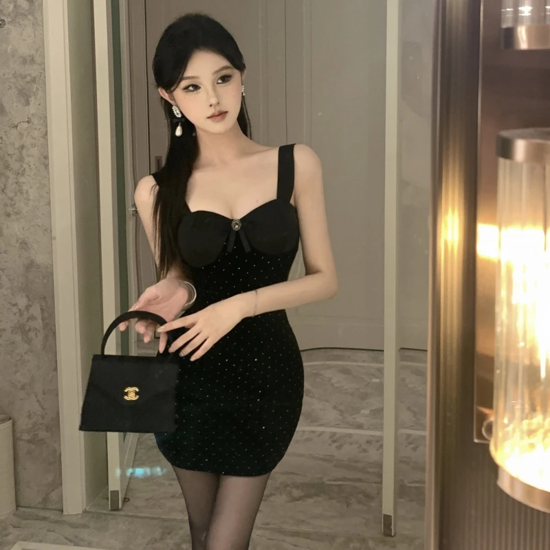 Black Bodycon Dress Has a square Neckline with Thin Straps and Sparkling Dot Details Creating an Elegant Evening Look