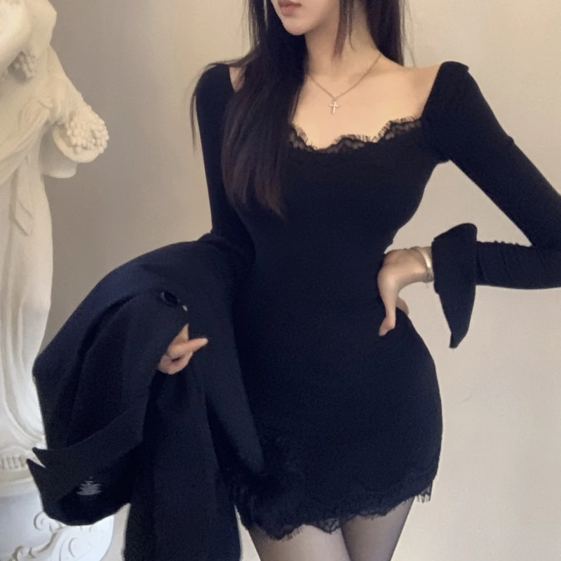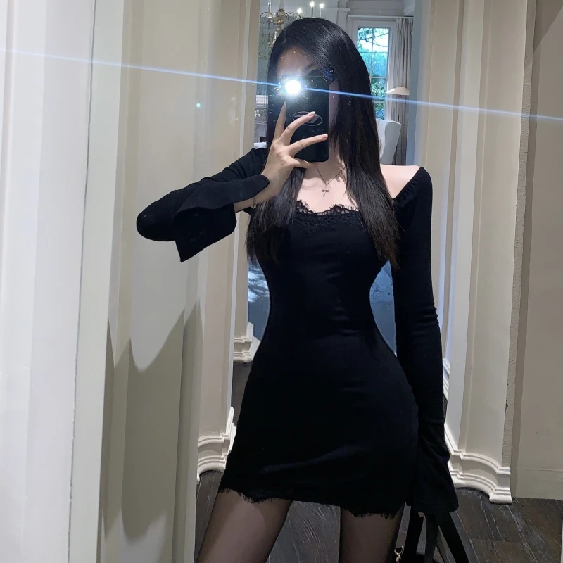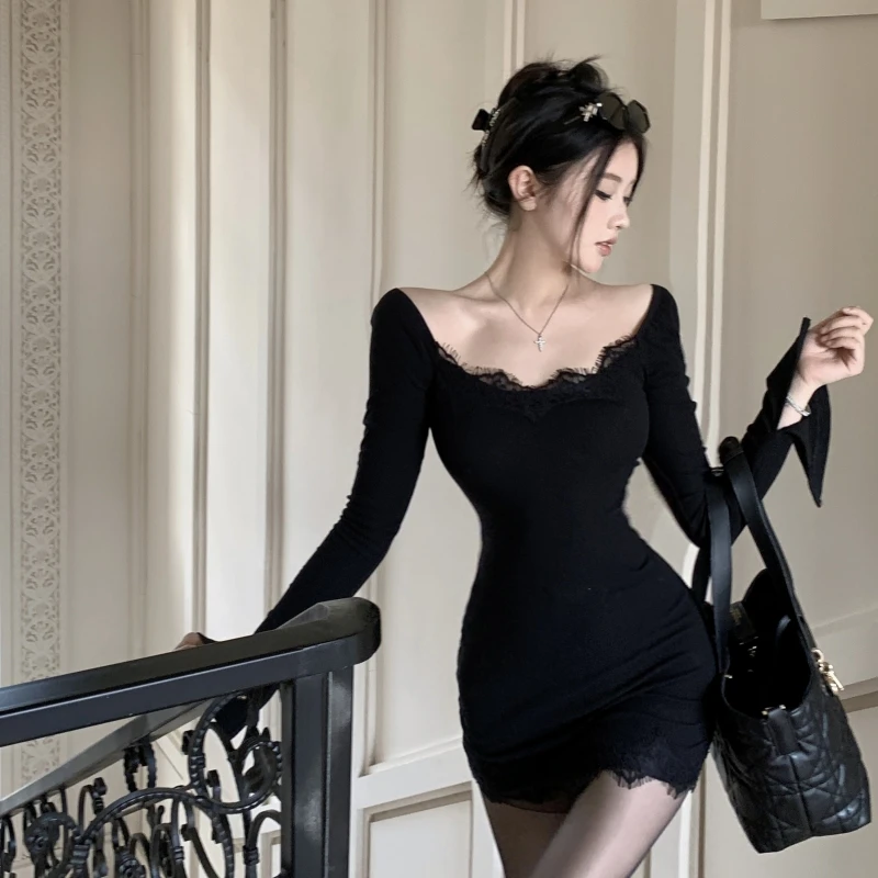 This Black Bodycon Dress Features an off - the - Shoulder Design with Delicate Lace Trim Adding a Touch of Elegance